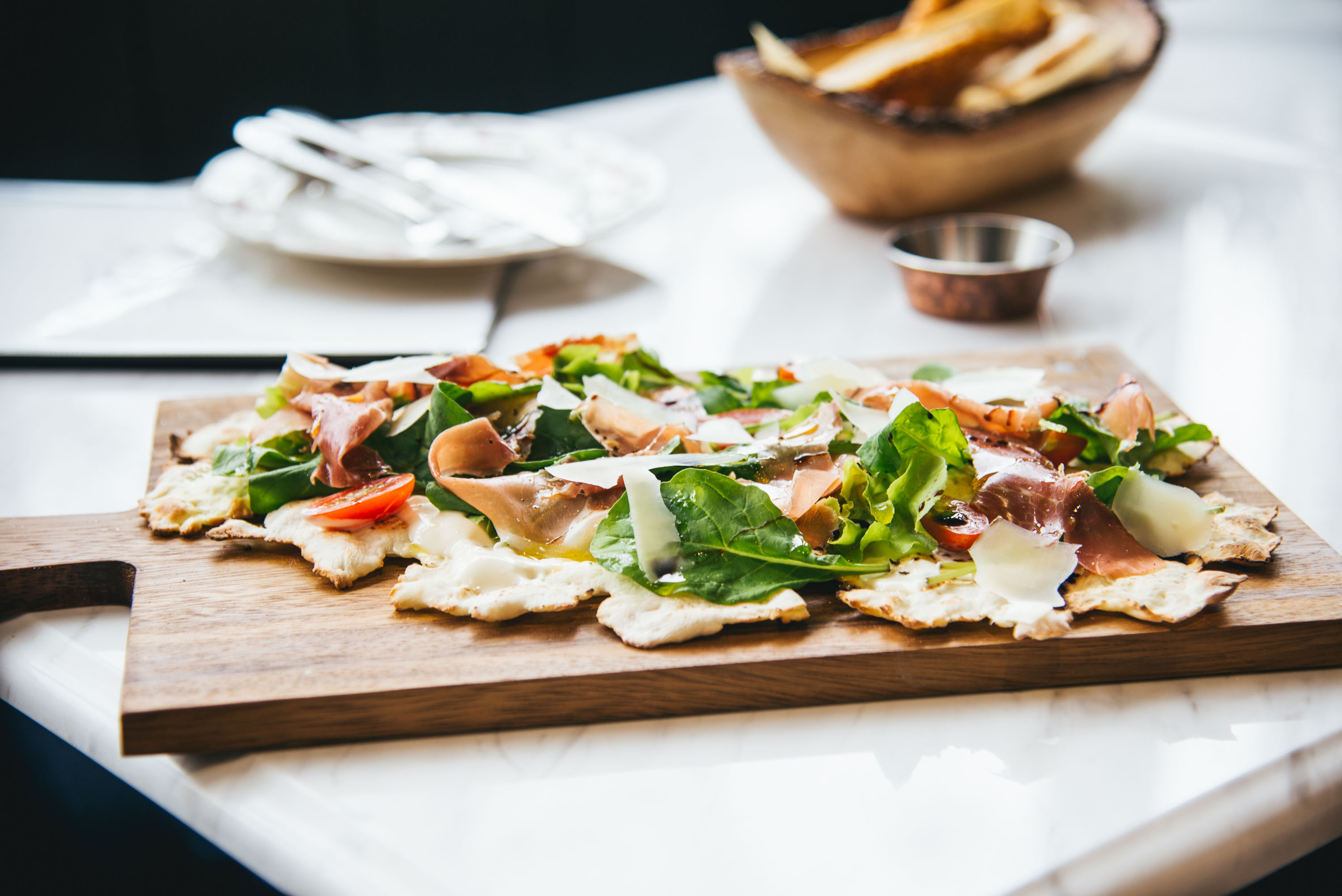อาหารของทางร้านส่วนใหญ่เน้นเป็นบรั๊นช์สไตล์อิตาเลียนและเมดิเตอร์เรเนียนที่ทานได้ทั้งวัน เริ่มต้นด้วยเมนูพิซซ่าอย่าง Rocket & Prosciutto (300 บาท) แป้งพิซซ่าบางกรอบ ราดน้ำมันมะกอก และซอสมายองเนสสูตรโฮมเมด ท็อปด้วยพาร์มาแฮมและผักร็อกเก็ต