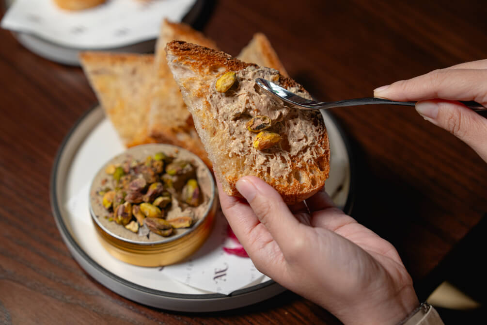 ถัดมาเป็นหมวด Starters เมนูแนะนำ คือ ปาเตตับไก่พิสตาชิโอ (320 บาท) ตับไก่บดสูตรเฉพาะของทางร้านที่นำไปหมักกับ Port Wine (ไวน์แดงเสริมรสชาติ ให้รสหวานเข้มข้นเป็นพิเศษ) 3 ชั่วโมง และใส่พิสตาชิโอลงไป เพื่อเพิ่มรสสัมผัสที่กรุบกรอบ