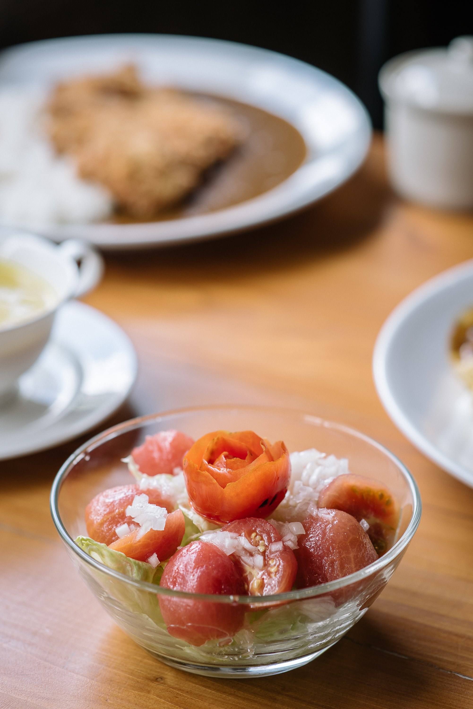 แถมยังมีตัวเลือกสำหรับคนทานมังสวิรัติอีกด้วยทั้ง Cold Pumpkin Soup (120 บาท), Tomato Salad (120 บาท), และ Caesar Salad (130 บาท) ให้เลือกทาน สำหรับระดับความเผ็ด ทางร้านมีพริก Cayenne Pepper สามารถเลือกเพิ่มได้ตามใจ และพิเศษเฉพาะที่นี่กับรากต้นหอมดองหรือ Rakkyo ที่หาทานค่อนข้างยาก กับ Fukujintsuke หรือรากบัวดอง เป็นเครื่องเคียง แถมข้าวยังเติมได้ไม่อั้น และไม่คิด Sevice Charge อีกด้วย