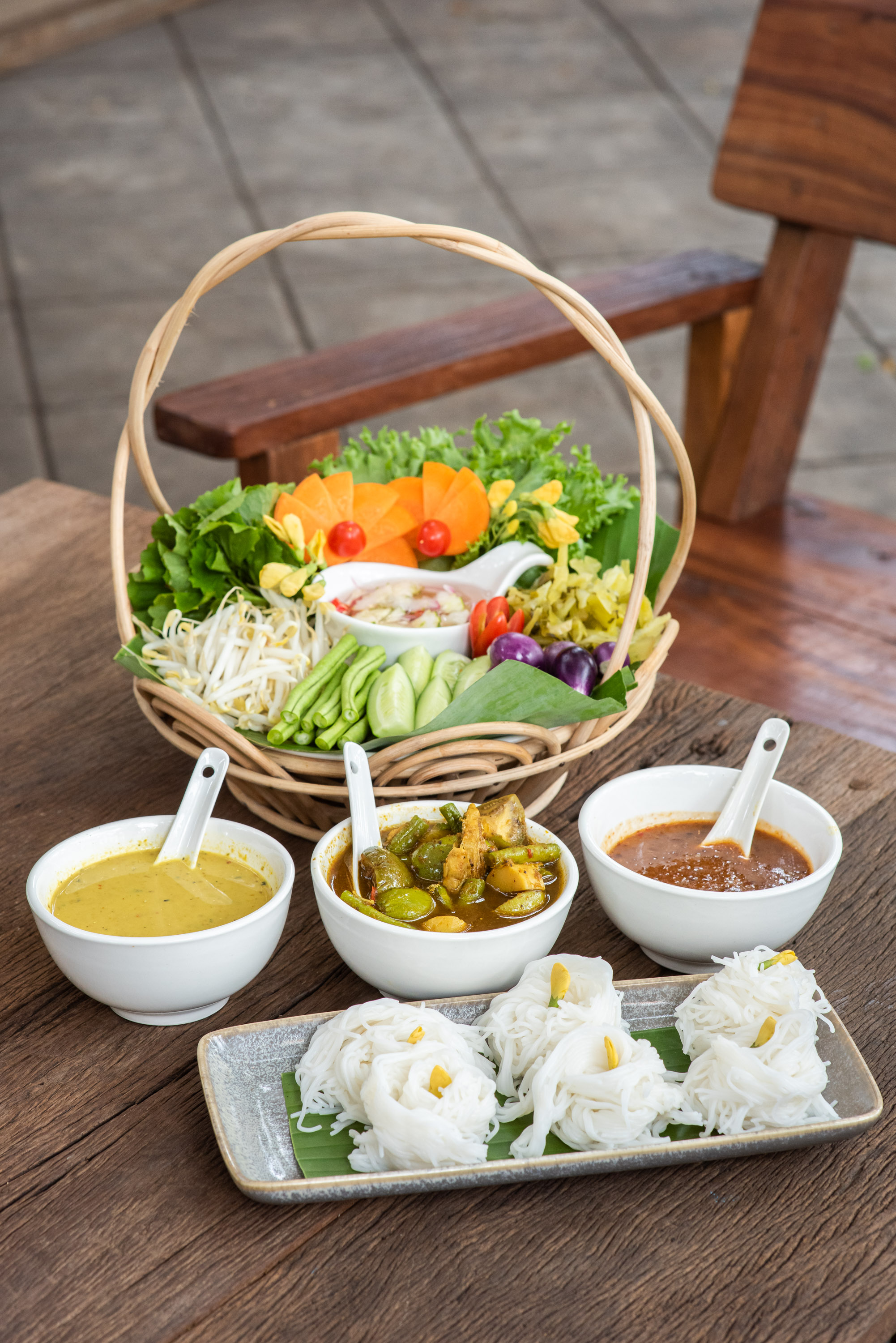 ทางด้านเมนูอาหาร ที่นี่ก็มีให้เลือกทั้งเครื่องดื่ม ขนม และไฮไลต์ของทางร้าน อย่างหลากหลายเมนูอาหารใต้รสชาติจัดจ้านในแบบต้นตำรับ และยังไม่ลืมใส่กิมมิกของดอกไม้ทานได้ที่ตกแต่งไว้ในทุก ๆ จานมาสร้างความประทับใจจนต้องถ่ายภาพไว้ลงโซเชียลกันก่อยทาน มาแล้วแนะนำให้ลองชิม ขนมจีน 3 น้ำยา (165 บาท) เสิร์ฟเซ็ตขนมจีนมาพร้อม 3 น้ำยาจากทางภาคใต้อย่างน้ำยากะทิ แกงไตปลา และน้ำพริกหวาน มาพร้อมผักสดตะกร้าโตให้เติมกันได้แบบจุใจ