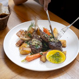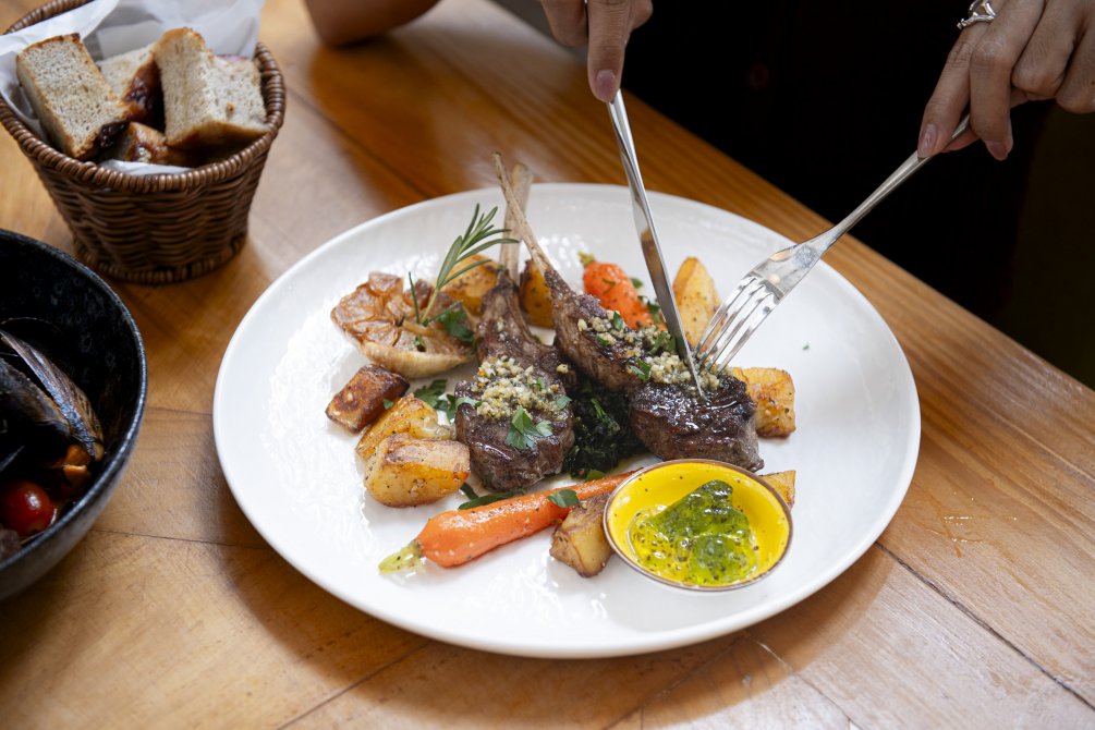 ส่วนจานสเต็กต้องยกให้ Grilled Lamb Chop (1,200 บาท) แลมป์ช็อปจากนิวซีแลนด์ ย่างด้วยไฟพอดีจนได้ความฉ่ำใน เนื้อนุ่มไม่มีกลิ่น เสิร์ฟพร้อมผักย่างหลากชนิด ทั้งแครอท เบบี้คอร์น บร็อกโคลี และมันบด เพิ่มความสมดุลของรสชาติและสีสันในจานอย่างลงตัว เหมาะสำหรับสายเนื้อที่ชอบความหอมแบบธรรมชาติ