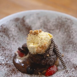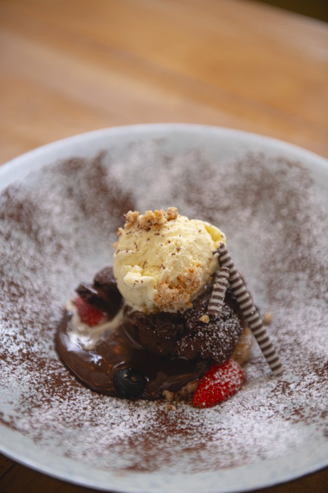 ปิดท้ายด้วยของหวานสุดคลาสสิกที่ทำออกมาได้ประณีตอย่าง Warm Chocolate Lava with Vanilla Ice Cream (400 บาท) ลาวาช็อกโกแลตเบลเยียมเนื้อฉ่ำ ไส้ช็อกโกแล็ตเข้มข้น เสิร์ฟคู่ไอศกรีมวานิลลาหอมหวานตัดกับความเข้มของช็อกโกแลต พร้อมผลไม้สดและกล้วยคาราเมลที่เพิ่มสัมผัสและความสดชื่น กลายเป็นความสุขที่ละลายในปาก จบมื้อนี้ได้อย่างน่าประทับใจ