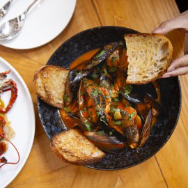 มาเริ่มต้นมื้อพิเศษกันที่เมนู Mussels in Tomato Sauce (550 บาท) ทาสมันเนียมัสเซิลส์ตัวอวบ สดหวานจากธรรมชาติ เสิร์ฟพร้อมซอสมะเขือเทศรสเข้มข้น หอมกลิ่นกระเทียมและเครื่องเทศ เคี่ยวจนได้รสกลมกล่อม เหมาะทั้งเป็นจานเรียกน้ำย่อย หรือแชร์กับเพื่อนร่วมโต๊ะ