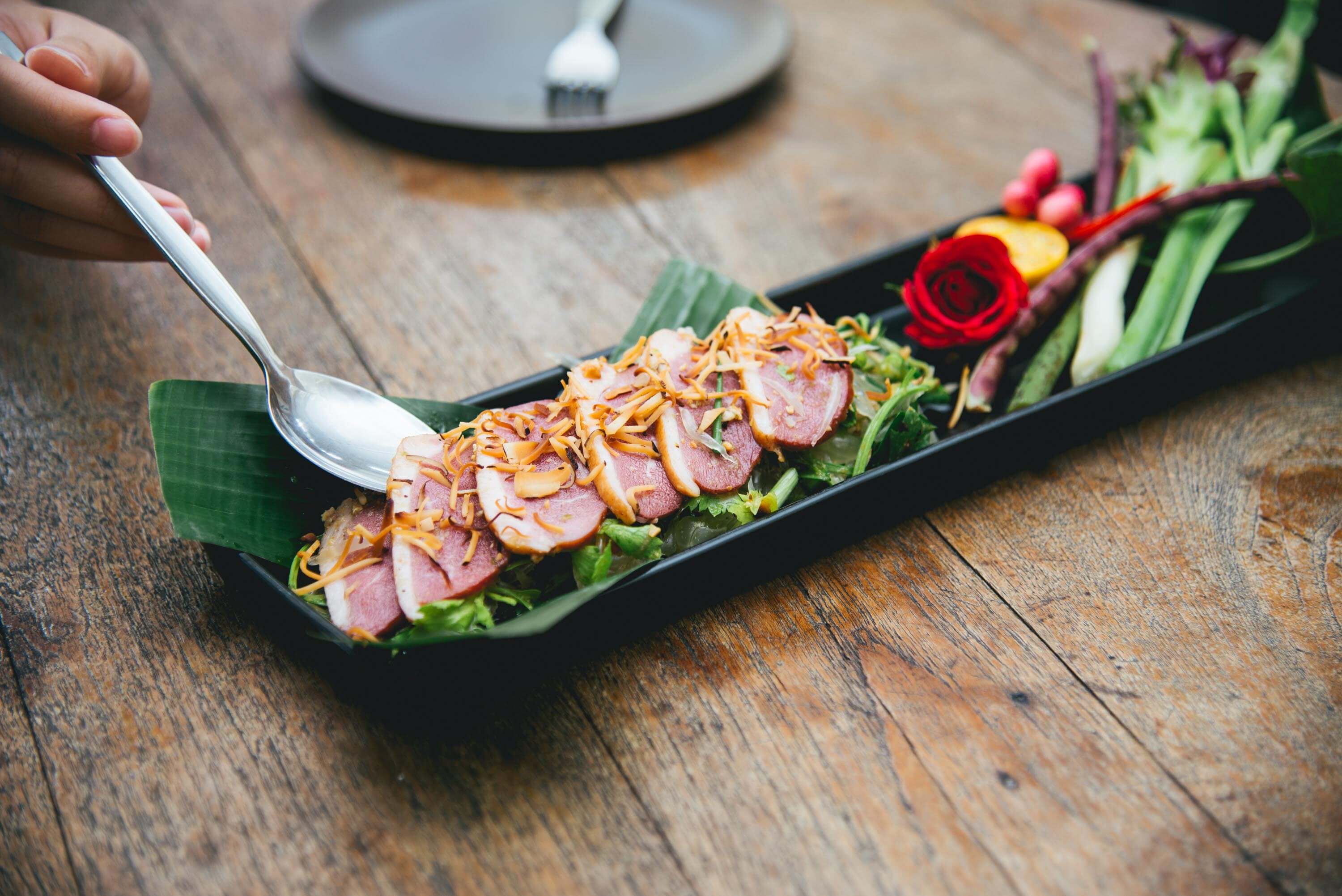 อาหารของทางร้านครีเอทโดยเชฟลุงณัฐ ผู้ที่นำเอาศิลปะมาผสมผสานกับอาหารไทย โดยถ่ายทอดผ่านการตกแต่งที่เสพได้ด้วยตาและสัมผัสได้ที่รสชาติ พร้อมยังตั้งชื่อเมนูให้น่าสนใจเพื่อให้ลูกค้าสามารถแลกเปลี่ยนหรือซักถามกับเชฟได้โดยตรง เมนูแรกที่เชฟแนะนำ ยำแมงมุม (185 บาท) เมนูสร้างสรรค์ โดยนำคางกุ้งมาทอดกรอบ แล้วคลุกเคล้ากับสมุนไพรไทย ได้แก่ ตะไคร้ ใบมะกรูด มะเขือเทศ ใบมะกรูด เม็ดมะม่วงหิมพานต์ และมะม่วงเปรี้ยว มีรสแซ่บ ถึงเครื่องยำสมุนไพรไทย