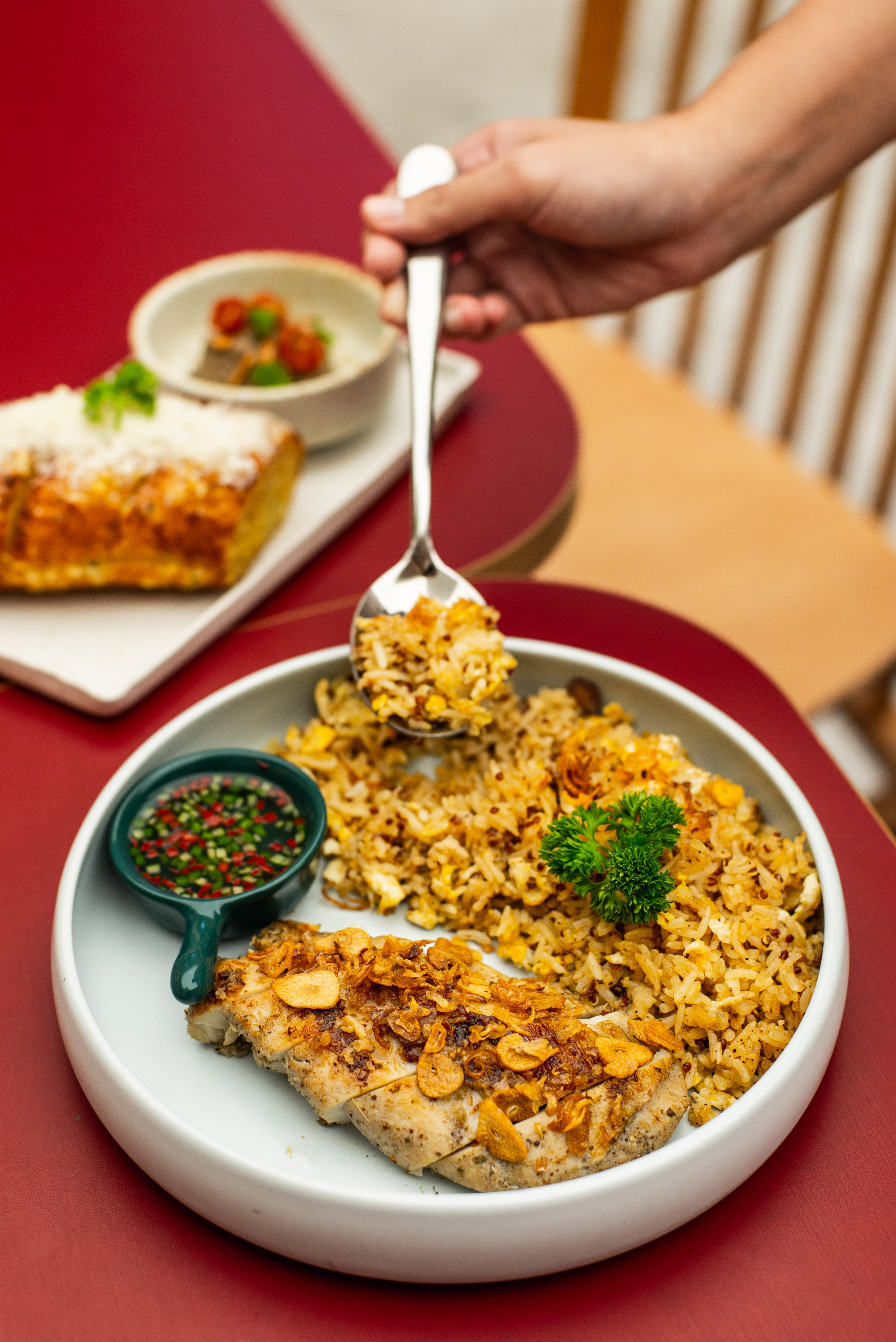 สำหรับใครที่มองหาเมนูอิ่มท้อง ต้องลอง Roasted Chicken with Herbal Quinoa Rice (195 บาท) ข้าวควินัวสมุนไพรไก่ย่าง อาหารจานหลักที่ถูกออกแบบมาให้บาลานซ์ระหว่างความอร่อยและสุขภาพที่ดี ทางร้านใช้อกไก่นุ่มหมักสมุนไพร ทำให้ได้ไก่เนื้อนุ่มไม่เหมือนที่ไหน เสิร์ฟพร้อมข้าวผัดไข่ผสมควินัวและน้ำจิ้มสูตรพิเศษของทางร้าน ทันทีที่ทานให้สัมผัสได้ถึงรสชาติกลมกล่อม พร้อมกลิ่นหอมของสมุนไพรแบบกำลังดี