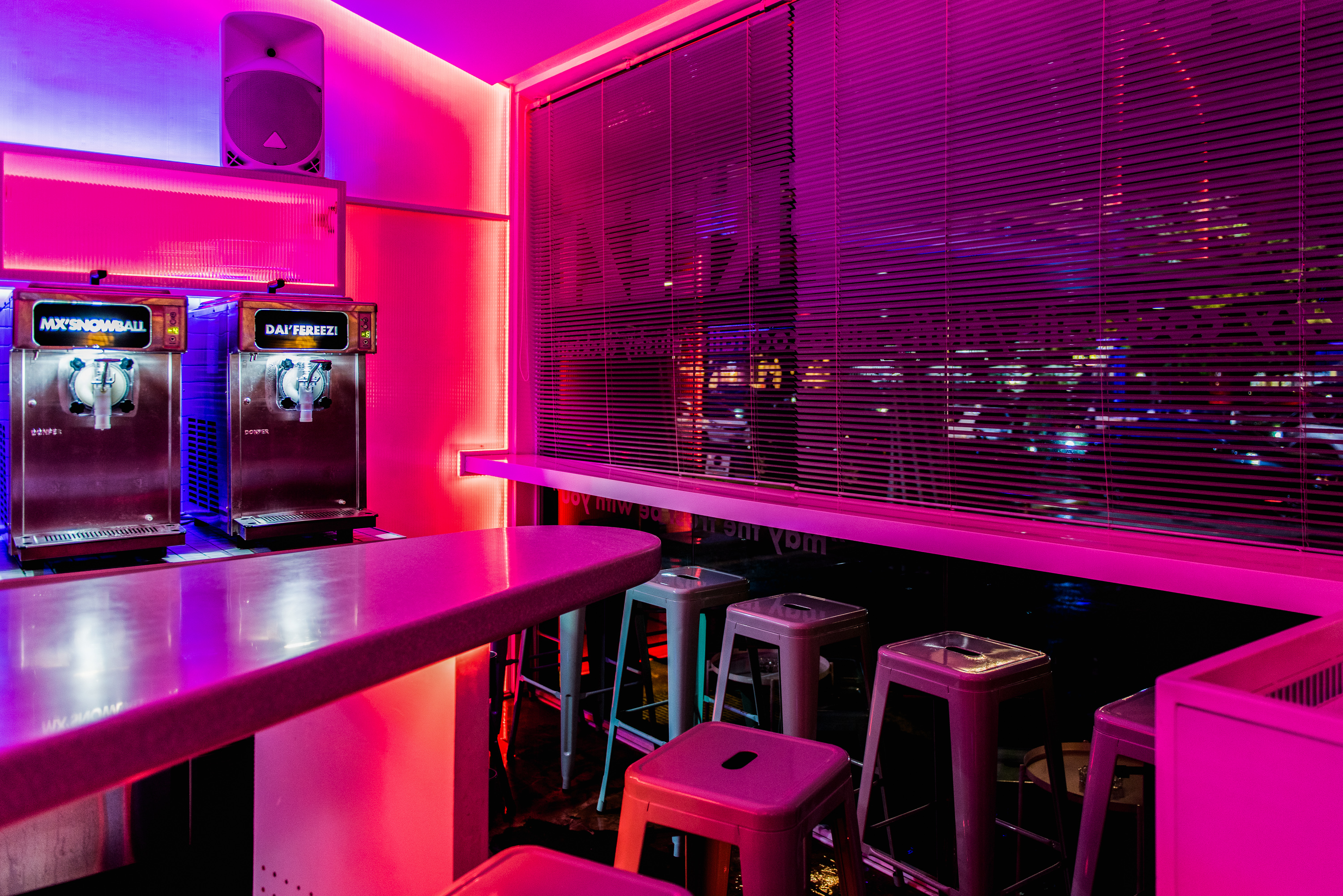 ทางร้านโดดเด่นด้วยไฟสีม่วงนีออน ภายในมีบาร์หินอ่อน ด้านหลังเป็นเครื่อง Slushies and Nitro Cocktails ที่นำเข้ามาจากอเมริกา และแท็ปค็อกเทล พร้อมใช้เฟอร์นิเจอร์หนังสีฟ้าให้เข้ากับแสงไฟนีออน ให้ความรู้สึกเหมือนได้เข้าไปอยู่ในอีกมิติ