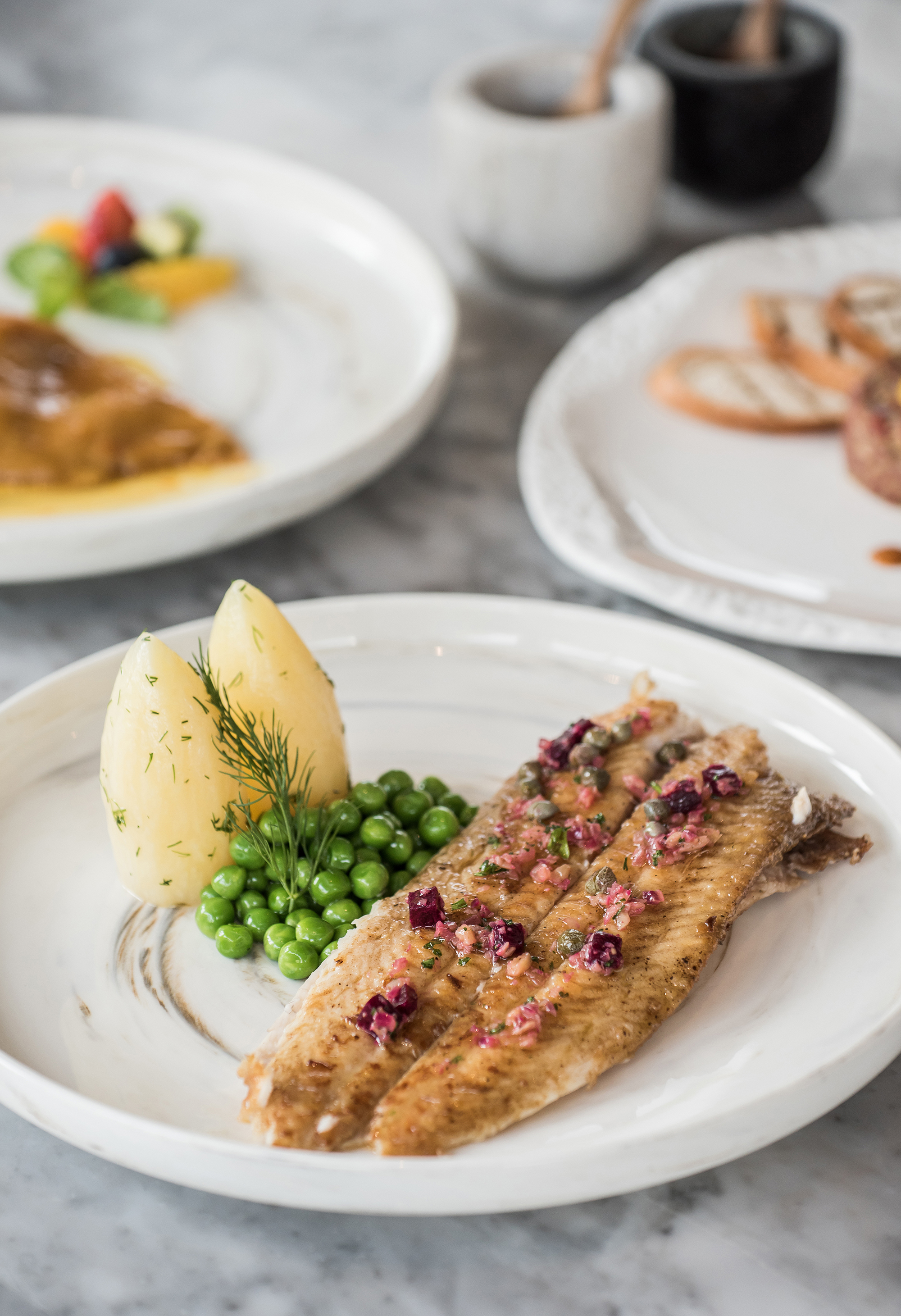 Dover Sole Served with Potatoes, Brown Butter, Capers and Beetroot (1,400 บาท)
