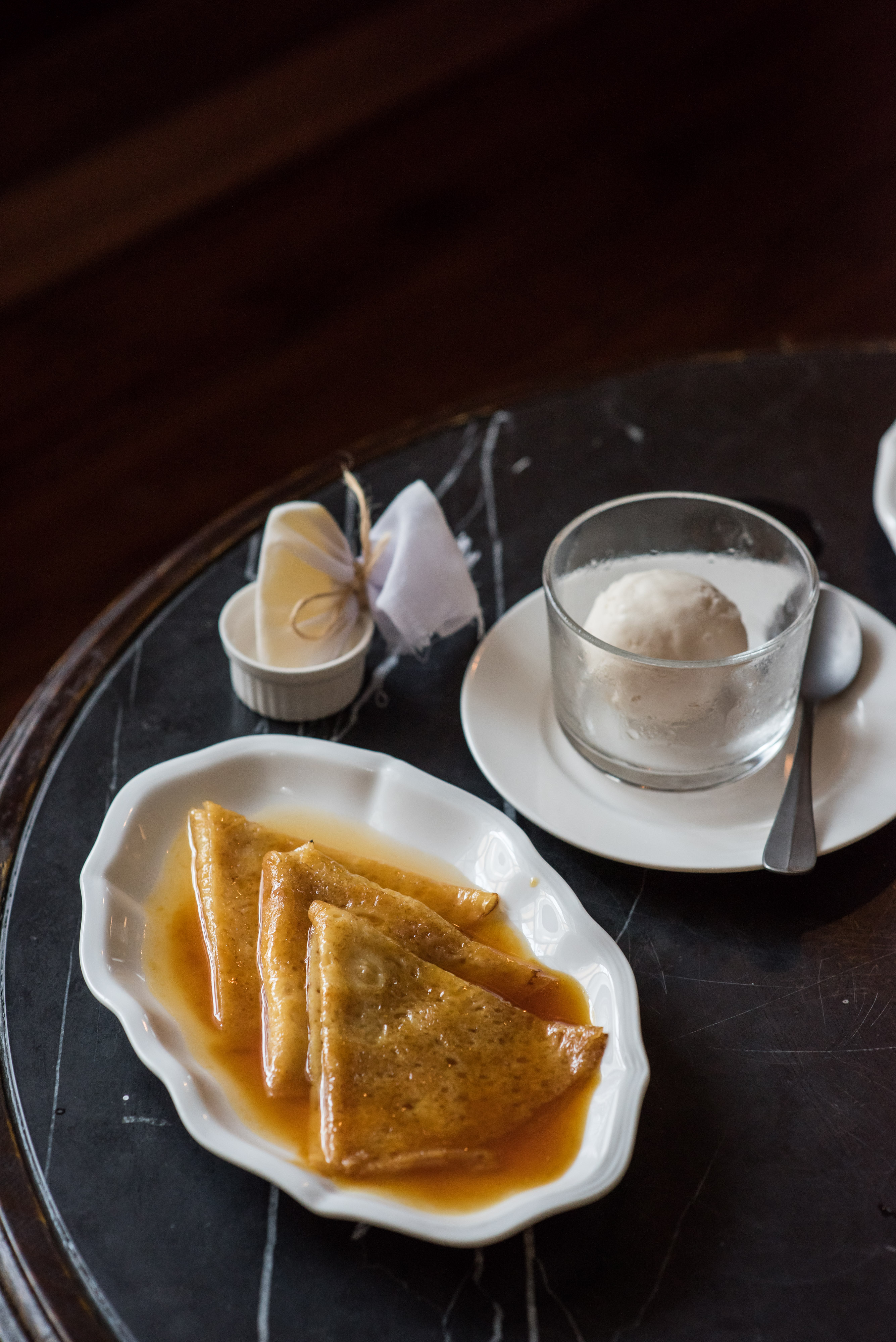 ปิดท้ายด้วยเมนูขนมหวานที่ห้ามพลาด คือ Crepe Suzette at Your Table (320 บาท) เครปโฮมเมดที่ทางร้านพร้อมเสิร์ฟบริการถึงโต๊ะ เผยให้เห็นถึงกรรมวิธีการทำตั้งแต่การเคี่ยวซอสด้วยส่วนผสมของส้ม เนย น้ำตาล และบรั่นดีที่นำมาเบิร์นเพื่อให้ได้กลิ่นหอม เสิร์ฟพร้อมไอศกรีมวานิลลาให้ทานคู่กัน