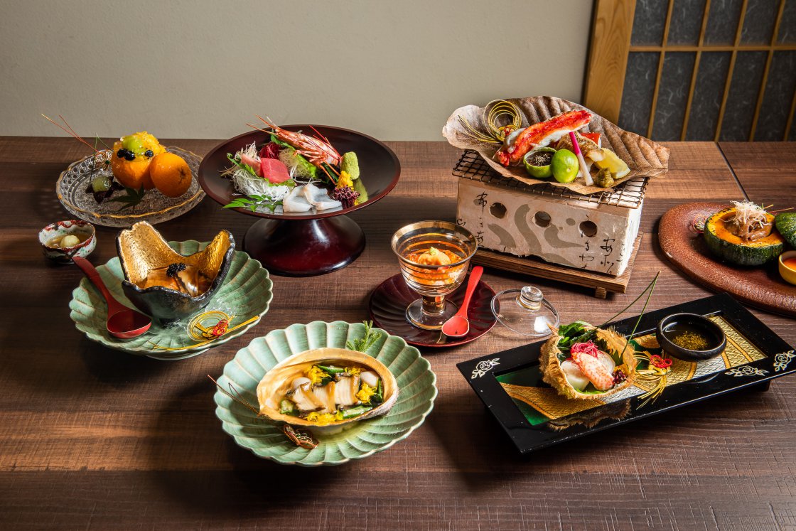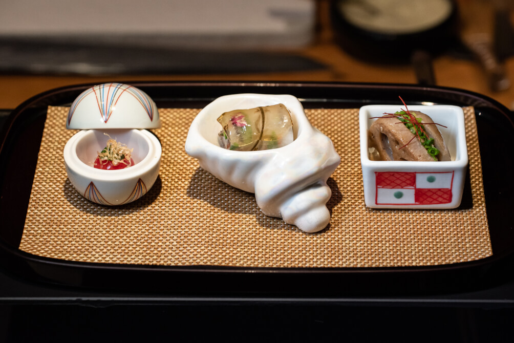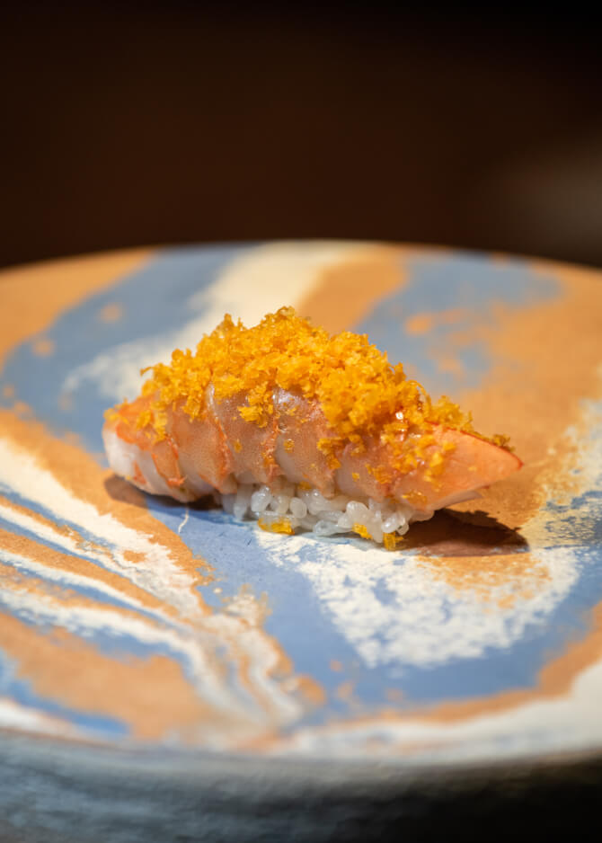 สลับด้วยเมนูที่เลือกใช้วัตถุดิบจากกุ้งบ้างอย่าง Ao Ebi Karasumi กุ้งหวานสีน้ำเงินที่นำไปลวกหรือปรุงสุกบางส่วน คำนี้ให้เนื้อสัมผัสนุ่มหนึบและรสหวานของกุ้ง ได้รสมันกุ้งเข้มข้น ก่อนโรยหน้าด้วยไข่ปลากระบอกตากแห้งที่ช่วยเพิ่มรสเค็มนิด ๆ ให้กลายเป็นความกลมกล่อมที่ลงตัว