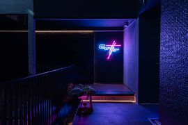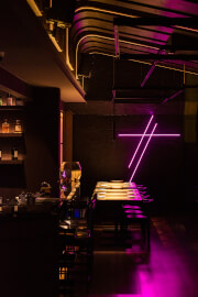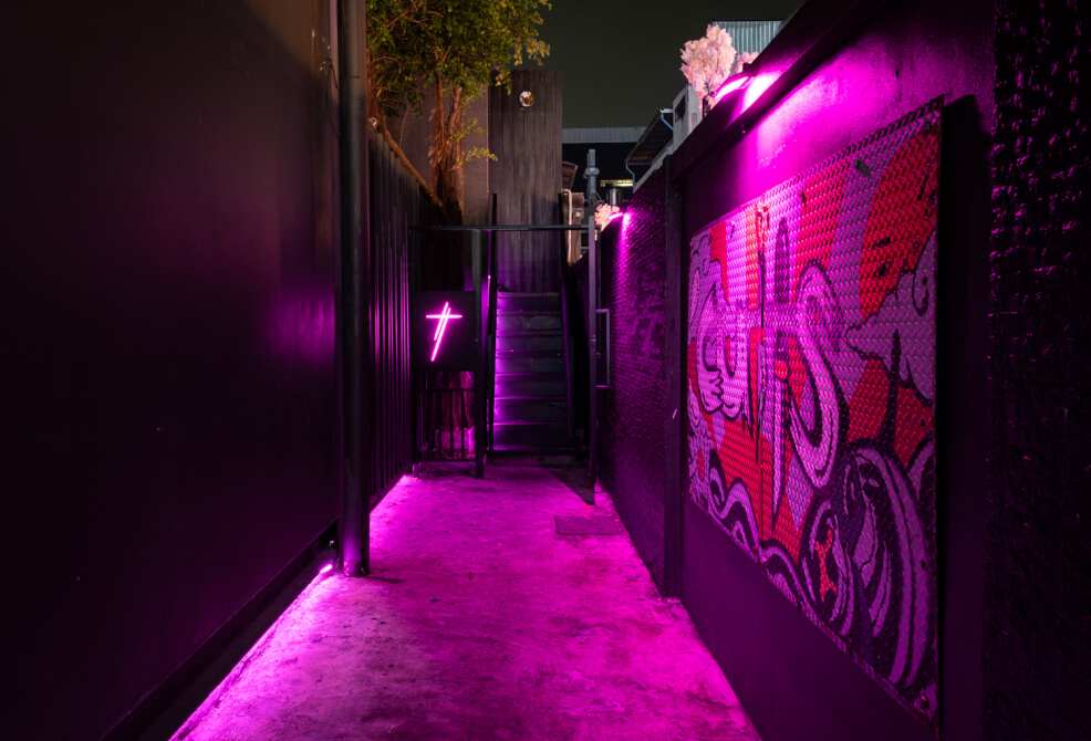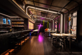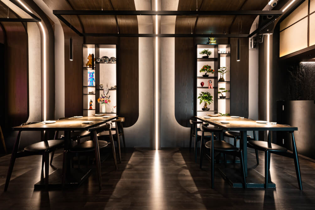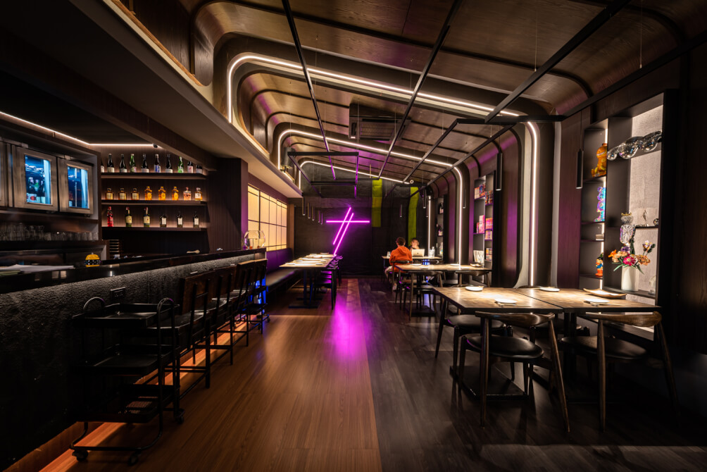 ในส่วนของคอนเซ็ปต์การออกแบบและตกแต่งภายใน ทางร้านได้แรงบันดาลใจมาจากบ้านญี่ปุ่นแสนสงบที่ซ่อนตัวอยู่ในโลกของเมืองที่วุ่นวาย โดยผสมผสานเสน่ห์อันแสนอบอุ่นและเป็นเอกลักษณ์ของบ้านญี่ปุ่นดั้งเดิมที่ให้ความรู้สึกย้อนยุคเข้ากับคาแรกเตอร์แบบการ์ตูนมังงะ พร้อมเพิ่มสีสันผ่านการตกแต่งด้วยไฟนีออน สะท้อนแนวคิด ‘Futuristic-minimalist’ ที่มีความล้ำสมัย สมกับที่เป็นจุดหมายปลายทางของสถานที่แฮงเอาต์ที่เต็มไปด้วยเรื่องราว อาหารเลิศรส และไวป์ของความสนุก ปลุกเอเนอร์จี้และความมีชีวิตชีวาให้กับผู้มาเยือนเสมอ