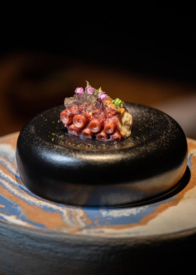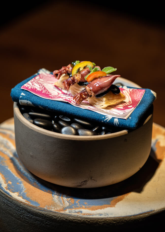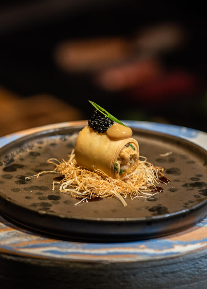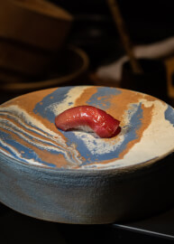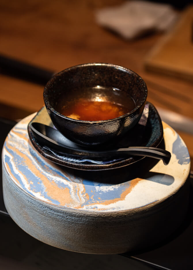 ทวีความเข้มข้นของรสชาติอาหารมื้อนี้ด้วย Ankimo Mousse มูสตับปลาอังโกะที่บีบลงในแป้งอบม้วน สอดไส้ด้วยไส้ดองน้ำส้ม ราดซอสมันกุ้ง แล้วท็อปด้วยโทบิโกะหรือไข่ปลาบินสีดำ ในหนึ่งคำให้รสมันและเนื้อสัมผัสที่มีความครีมมี่ ตัดด้วยรสเปรี้ยวเค็มจากการผสมผสานวัตถุดิบต่าง ๆ ได้อย่างลงตัว