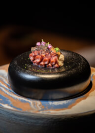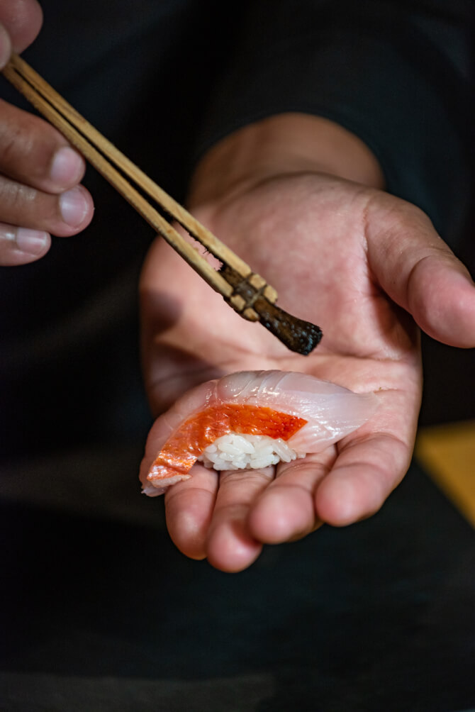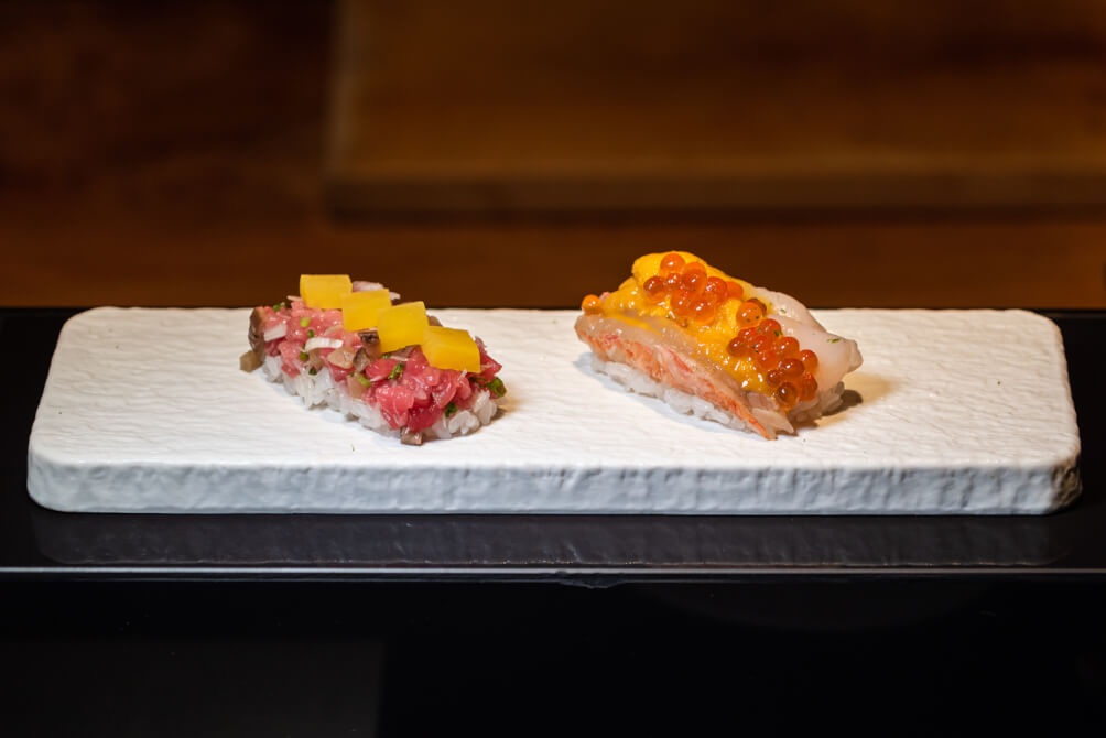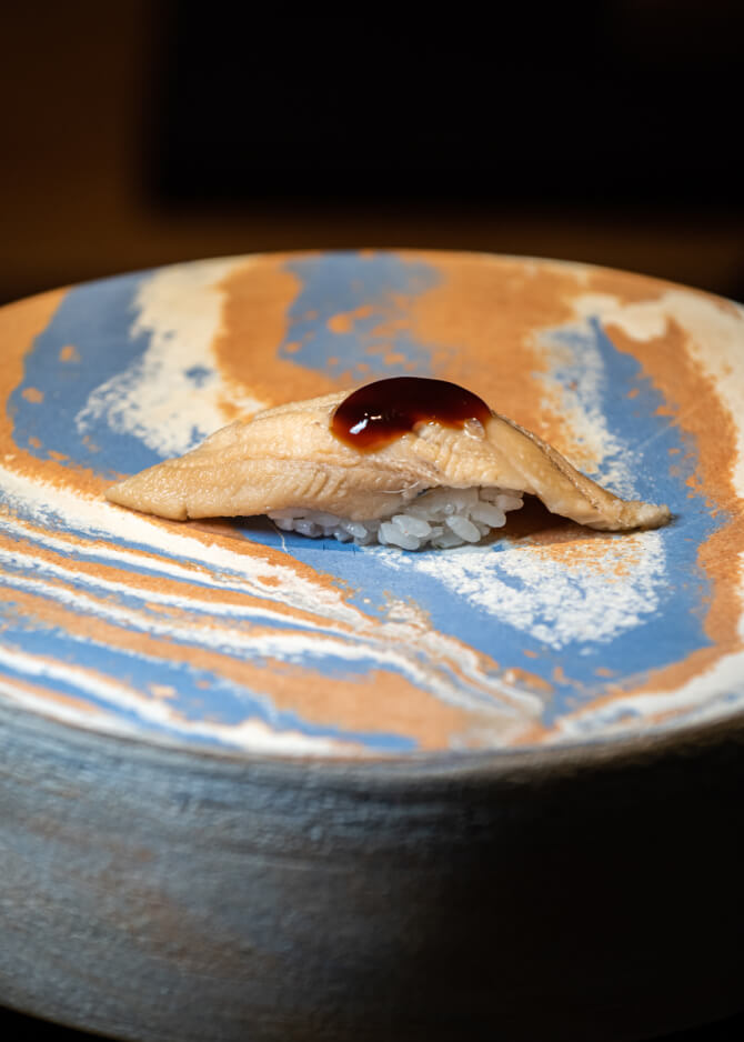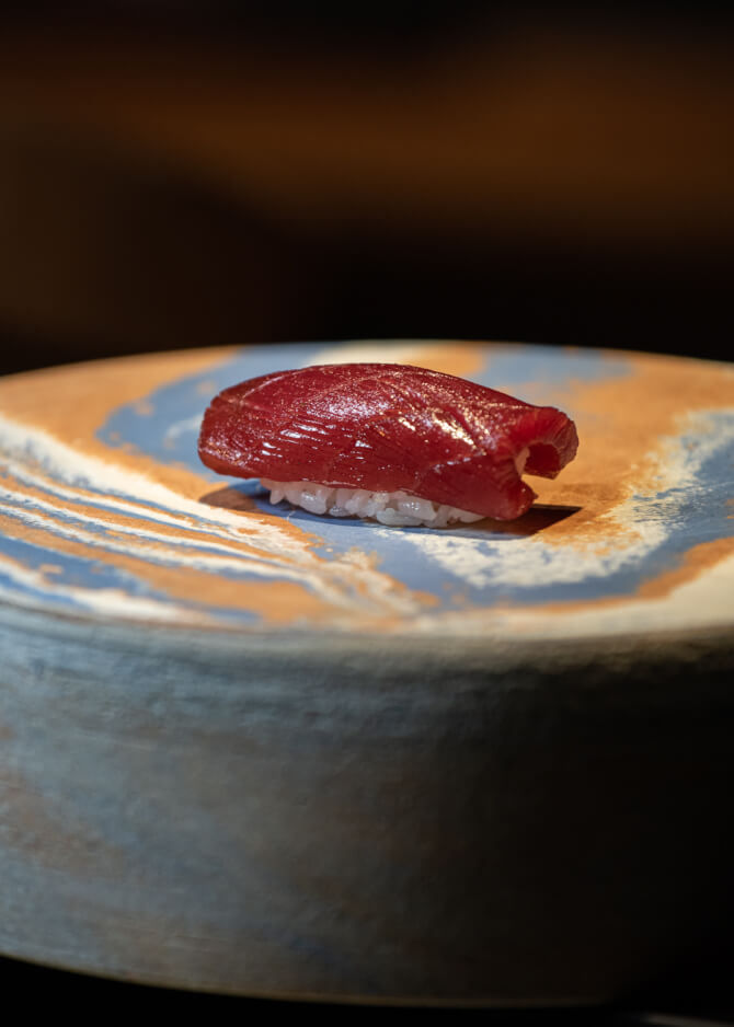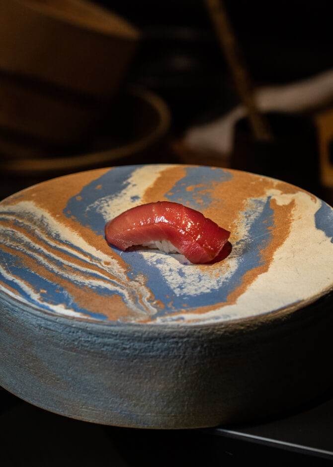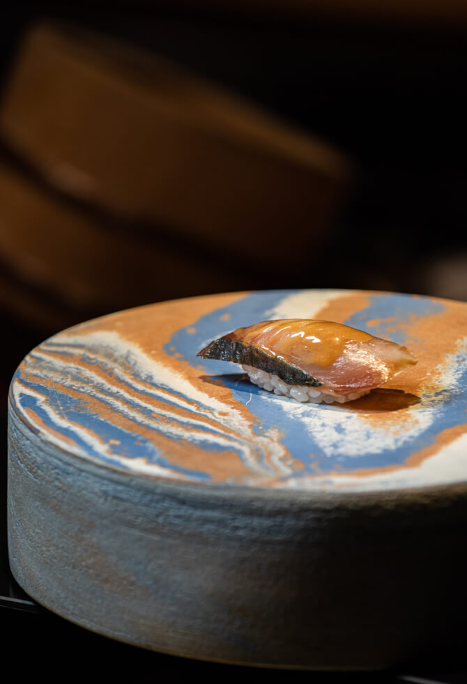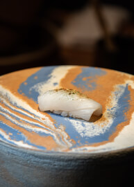 Shima Aji Goma Zuke ปลาชิมาอาจิ หรือปลาทะเลน้ำลึกเนื้อขาวหนังเงินหาทานยาก ในกลุ่มปลากะมง ที่เชฟนำไปแช่ในซอสโชยุและงาขาว เพื่อให้ได้รสกลมกล่อม ก่อนเบิร์นหนังเล็กน้อยเพื่อเพิ่มกลิ่นหอมและเนื้อสัมผัสที่ดียิ่งขึ้น
