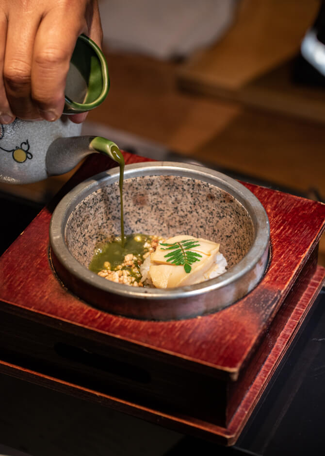 ตามด้วยการเสิร์ฟ Awabi Hot Stone เซ็ตหอยเป๋าฮื้อในหม้อร้อน หั่นสไลด์มาแบบพอดีคำ ซึ่งด้านล่างจะเป็นข้าวซูชินุ่ม ๆ และข้าวพองที่ได้จากการนำข้าวซูชิไปทอดกรอบ ก่อนเสิร์ฟเชฟจะนำซอสตับหอยเป๋าฮื้อมาราดบนเป๋าฮื้อ วิธีรับประทานแนะนำให้คนส่วนผสมทั้งหมดให้เข้ากัน จะได้ความหวานหอมของตัวซอสที่เข้ากับความนุ่มหนึบของเป๋าฮื้อและรสเปรี้ยวเล็กน้อยของข้าวญี่ปุ่นที่รวมเป็นความกลมกล่อมในหนึ่งเดียว