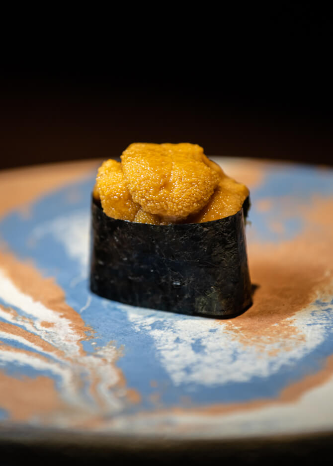 มาถึงเมนูไฮไลท์อย่าง UNI ซูชิไข่หอยเม่นที่ทางร้านเลือกใช้เป็นสายพันธุ์มูราซากิ (Murasaki) ซึ่งให้รสมันและกลิ่นอายของท้องทะเลแบบชัดเจน