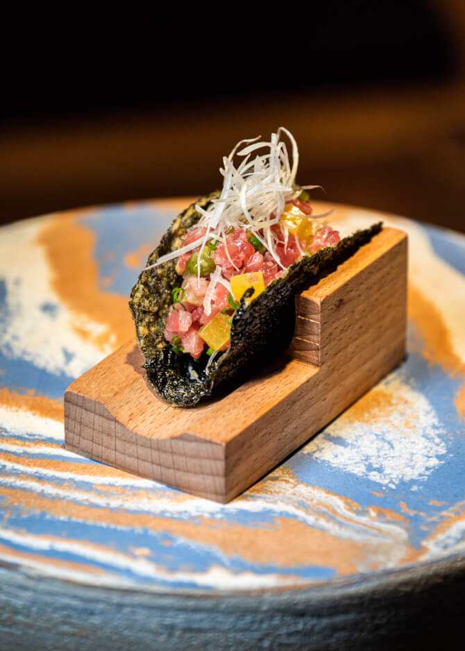 จากนั้นเชฟก็สลับมาเสิร์ฟความอร่อยด้วยเมนูห่อสาหร่ายอย่าง Torotaku Nori Taco ซึ่งเชฟได้นำปลามากุโระ หรือเนื้อทูน่า 3 ส่วน ทั้ง akami, chuotoro และ otoro มาสับรวมกัน ผสมเข้ากับไชเท้ารมควันและไชเท้าดองน้ำส้ม แล้วนำมาใส่ในสาหร่ายทอดกรอบด้วยลักษณะแบบการรับประทานทาโก้ ส่วนด้านบนท็อปด้วยวาซาบิดองและต้นหอมญี่ปุ่น เป็นอีกหนึ่งคำไฮไลท์ที่ให้รสชาติหลายมิติ