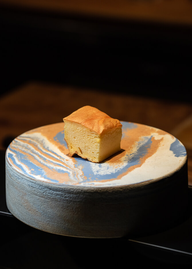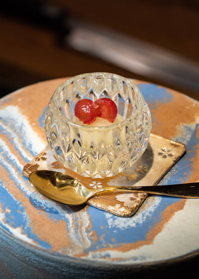 หลังจากเสิร์ฟเมนูของคาวเสร็จแล้ว ก็ต่อเนื่องกันด้วยขนมหวานอย่าง Cutts Castera Tamago เค้กไข่เนื้อนุ่ม ซึ่งเป็นสูตรเฉพาะของทางร้านที่ทำแป้งเค้กออกมาให้เนื้อสัมผัสนุ่มเบาเป็นพิเศษก่อนจะปิดท้ายคอร์สกันด้วย Yuzu Sorbet ไอศกรีมยูซุซอร์เบท รสเปรี้ยวอมหวาน รับประทานเพิ่มความเย็นสดชื่นระหว่างมื้อ ถือเป็นการส่งท้ายมื้อโอมากาเสะนี้ได้อย่างน่าประทับใจ