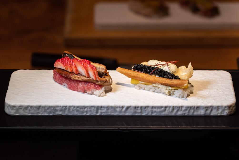 Foie Gras Maki เมนูมากิที่ไส้ด้านในประกอบด้วยฟัวกราส์ทอดผสมเนื้อปลาไหลทะเล เสริมรสชาติด้วยสตรอเบอร์รีและเนื้อทูน่าสับ เป็นการผสานความอร่อยที่ลงตัว