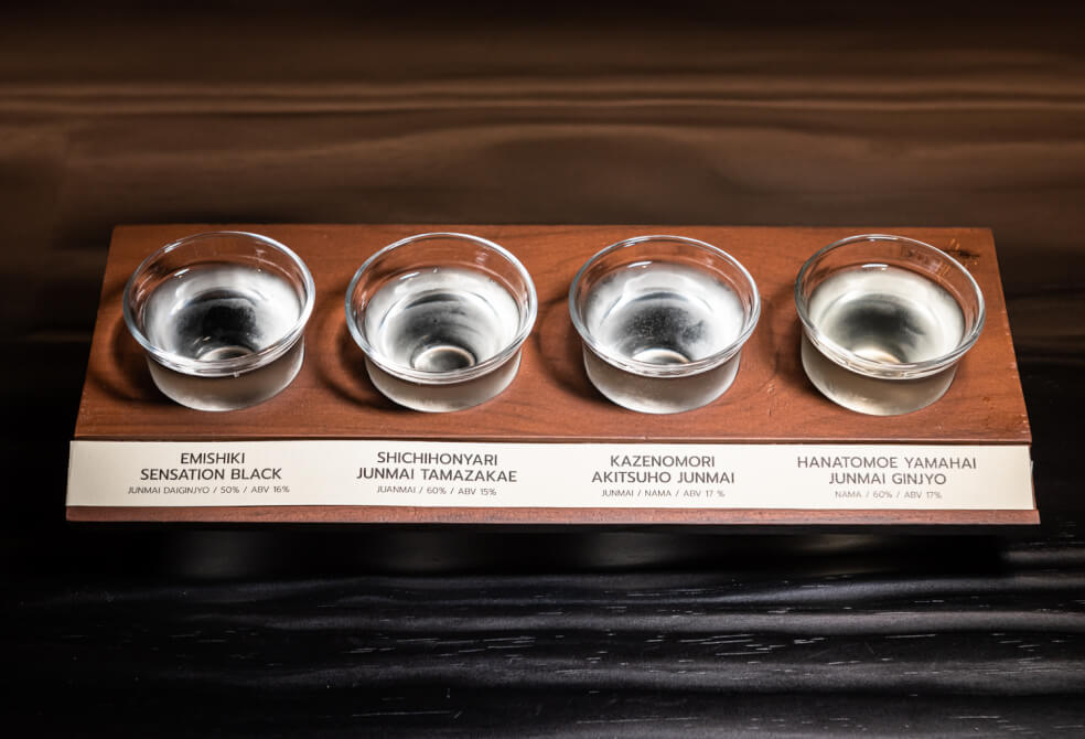 นอกจากคอร์สโอมากาเสะและเซ็ตซูชิแฮนด์โรลพรีเมียมที่สะท้อนให้เห็นถึงความพิถีพิถันในการคัดสรรวัตถุดิบ การจัดเตรียมและการจัดองค์ประกอบรสชาติที่ซับซ้อน เพื่อสร้างสรรค์ประสบการณ์ทานโอมากาเสะที่มอบประทับใจให้แก่ผู้มาเยือนแล้ว แน่นอนว่าที่นี่ยังพร้อมส่งมอบวัฒนธรรมการกิน-ดื่มของคนญี่ปุ่นแบบสมบูรณ์ด้วยการเสิร์ฟ Sake Flight (เซ็ตละ 650++ บาท) เซ็ตเครื่องดื่มสาเกคุณภาพ 4 แบบ ได้แก่ Emishiki Sensation Black, Shichihonyari Janmai Tamazakae, Kazenomori Akitsuho Junmai และ Hanatomoe Yamahai Junmai Ginjyo ส่งตรงจากหลากหลายจังหวัดในประเทศญี่ปุ่น ให้ได้เลือกจับคู่ความอร่อยระหว่างมื้ออาหารอีกด้วย