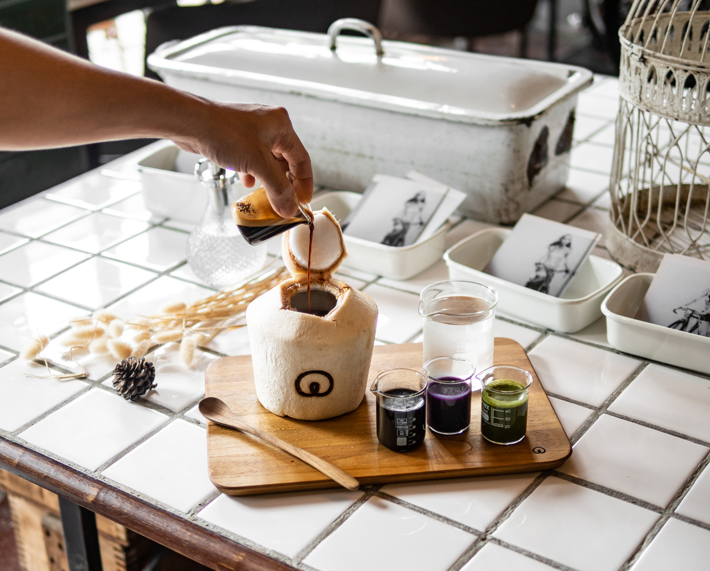 Concept ของทุกเมนูที่นี่คือ Half Fat และ Half Sugar แนะนำเป็นเมนูขายดีอย่างเมนูตระกูล Coco (120 บาท) ที่เสิร์ฟมะพร้าวสดทั้งลูก โดยสามารถเลือกได้ว่าจะราดด้วยช็อตชาร์โคล (Black) ชาเขียว (Green) มันม่วง (Purple) หรือกาแฟ (Brown)
