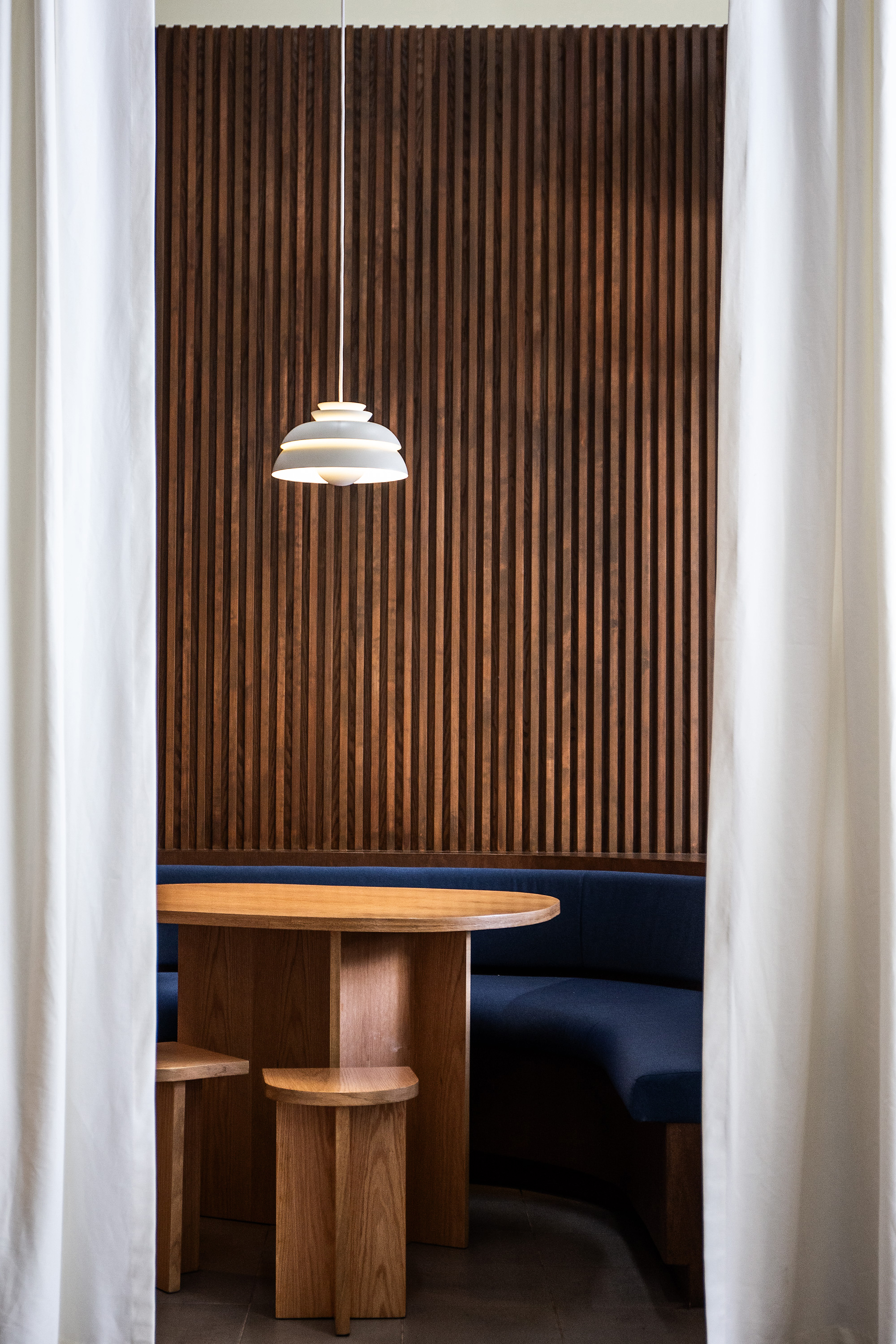 DROP BY DOUGH พร้อมต้อนรับผู้มาเยือนด้วยบรรยากาศสบาย ๆ อันโดดเด่นด้วยการตกแต่งที่ได้รับแรงบันดาลใจมาจากแถบสแกนดิเนเวียนในโทนสีน้ำเงินสะดุดตาตัดกับสีน้ำตาลของวัสดุไม้ ที่ให้กลิ่นอายของความเรียบหรู พร้อมเพิ่มความชิคคูลด้วยผ้าม่านสีครีม เหมาะสำหรับใครที่ต้องการความเงียบสงบแบบเป็นส่วนตัว โดยเปิดรับแสงธรรมชาติด้วยกระจกใสบานใหญ่ ที่ช่วยสร้างความอบอุ่นในระหว่างวันได้เป็นอย่างดี นอกจากนี้ ยังโดดเด่นด้วยการเลือกใช้เฟอร์นิเจอร์ดีไซน์สวย พร้อมให้คุณได้เพลิดเพลินไปกับเสน่ห์ของความเรียบง่ายที่สายมินิมอลจะต้องหลงรัก