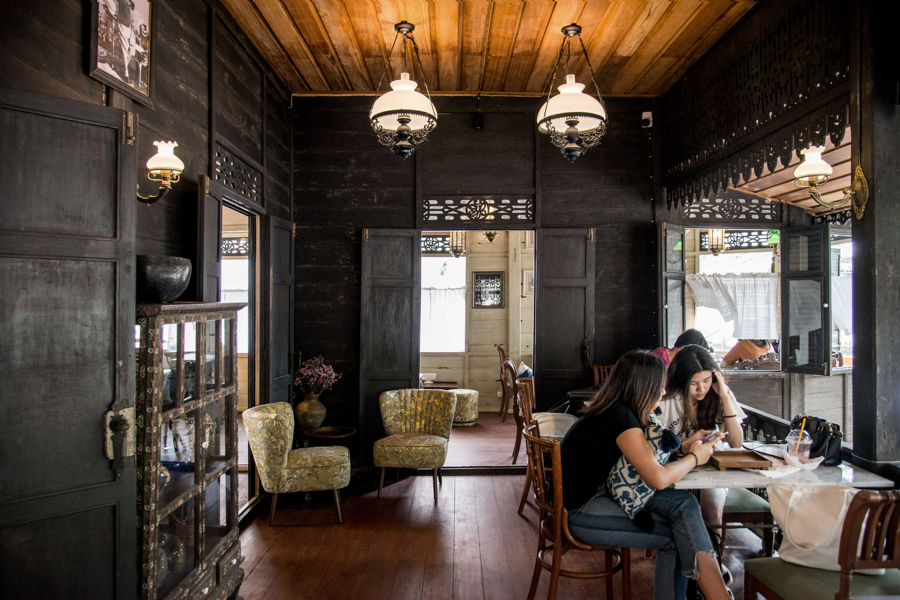 ที่นั่งริมหน้าต่างบนชั้น 2 ที่ยกฝ้าเพดานขึ้นเพื่อให้อากาศปลอดโปร่ง