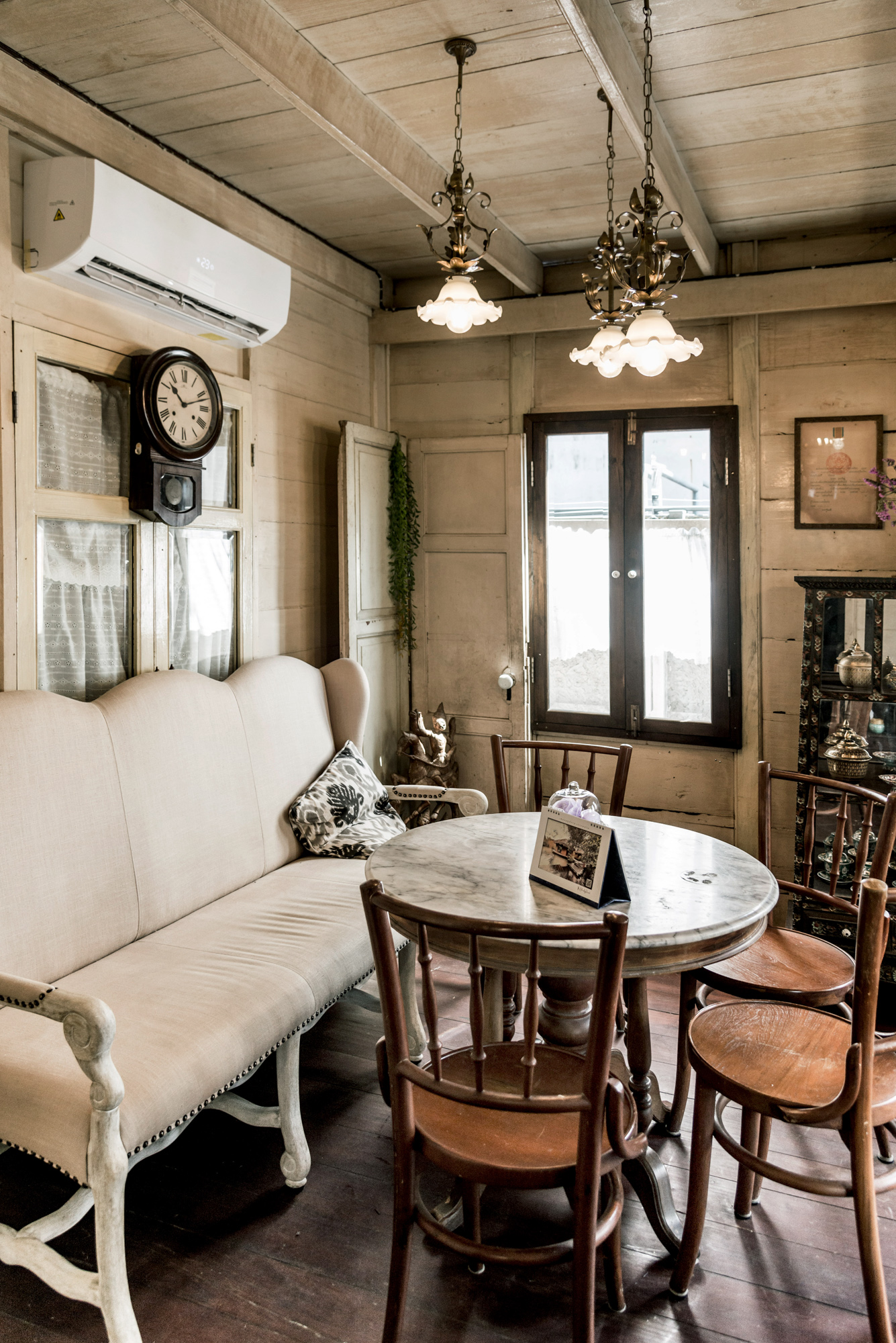 ที่นั่งริมหน้าต่างบนชั้น 2 ที่ยกฝ้าเพดานขึ้นเพื่อให้อากาศปลอดโปร่ง