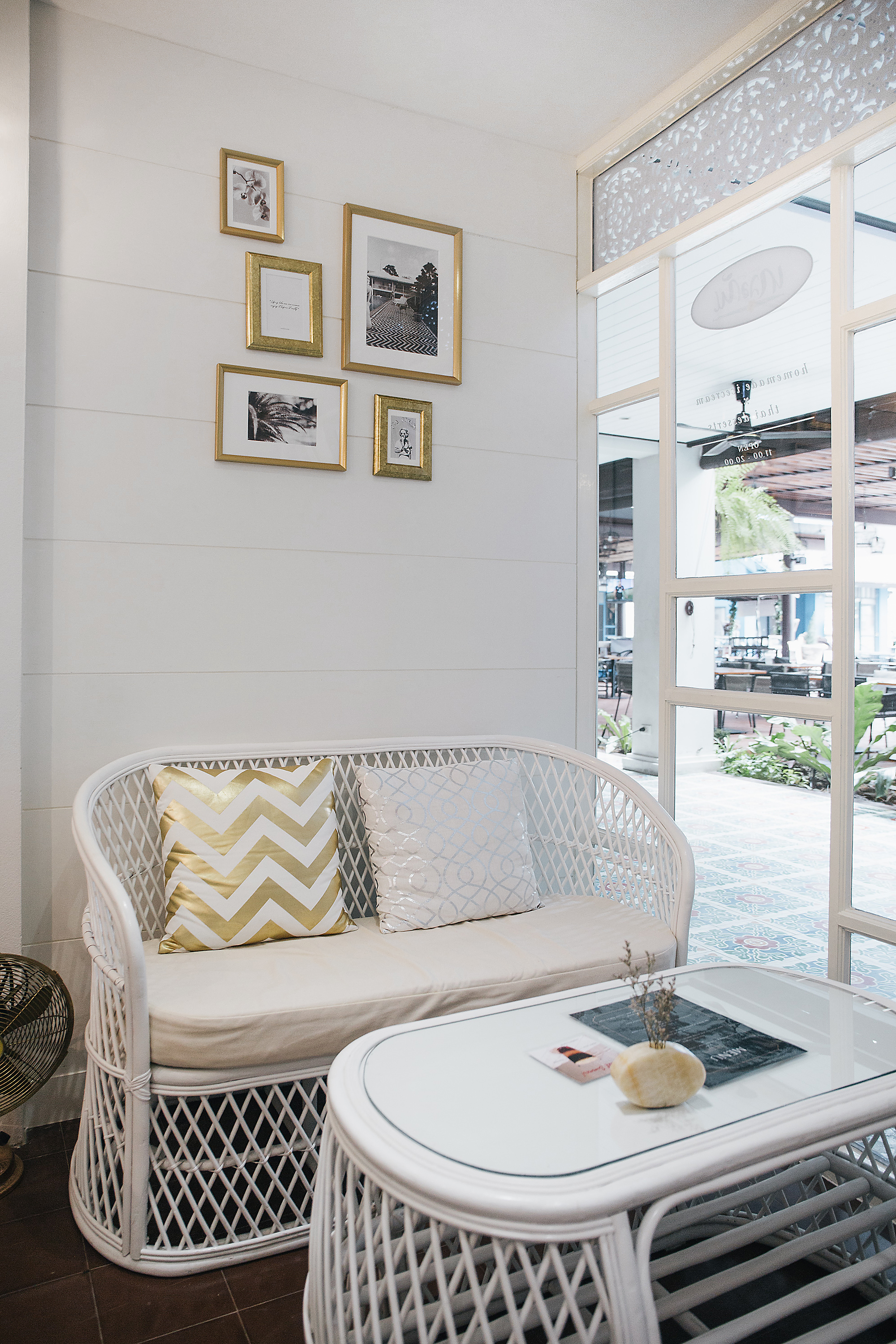 โซฟาเก้าอี้สาน โต๊ะหินอ่อน โคมไฟ และกรอบรูปแนววินเทจที่เพิ่มมู้ดแอนด์โทนให้ตัวร้านดูอบอุ่น