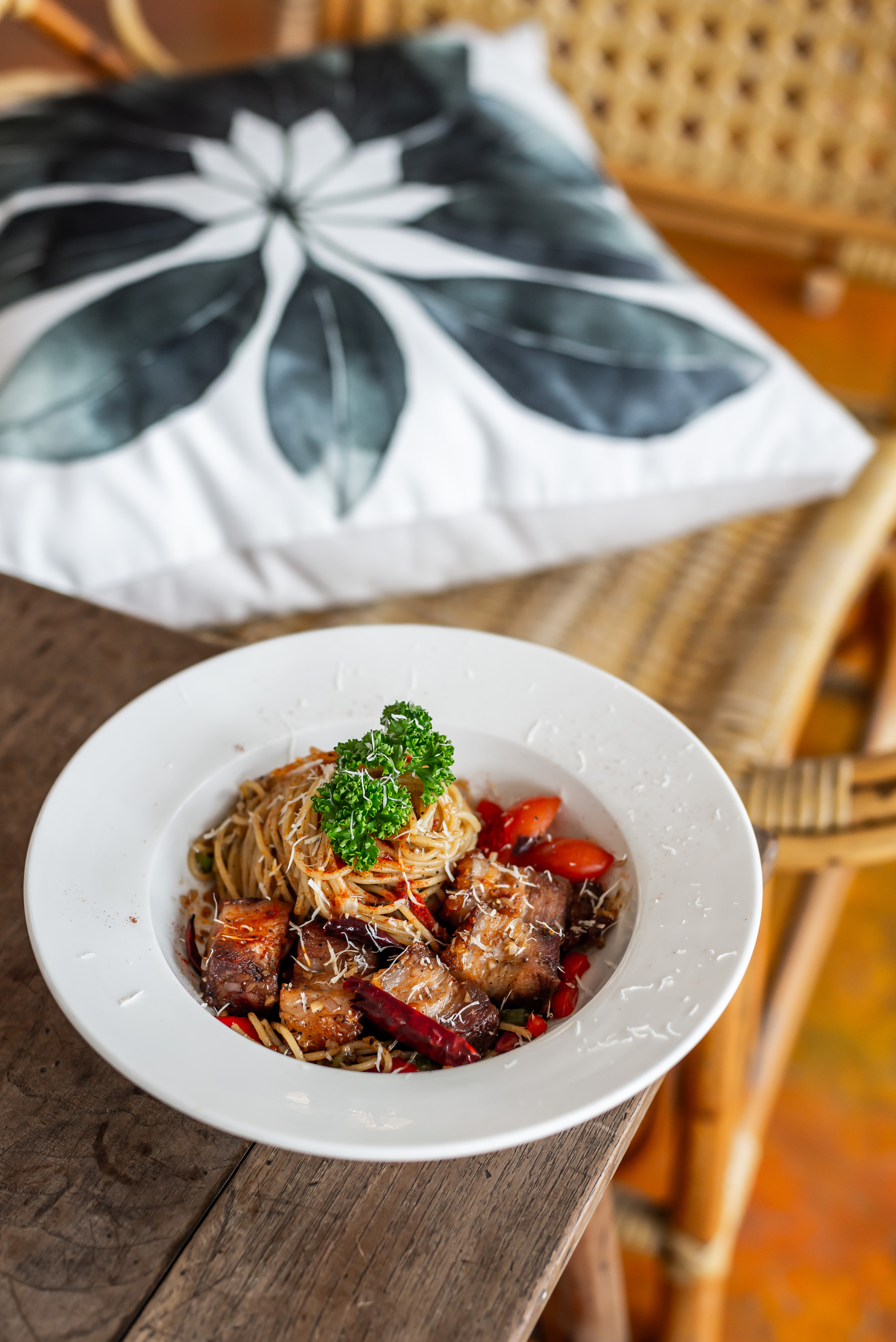 นอกจากเมนูขนมแล้ว เมนูอาหารสไตล์ Comfort Food ของที่นี่ก็ขายดีไม่แพ้กัน อย่างจานชูโรงจานนี้ Spaghetti Crispy Pork (170 บาท) สปาเก็ตตี้ผัดแห้งรสเข้มข้น หอมกรุ่นด้วยกลิ่นเครื่องเทศแบบไทย ๆ ที่คลุกเคล้ามาพร้อมกับหมูกรอบหั่นชิ้นพอดีคำ เป็นอีกหนึ่งจานอิ่มท้องที่ไม่ควรพลาดด้วยประการทั้งปวง