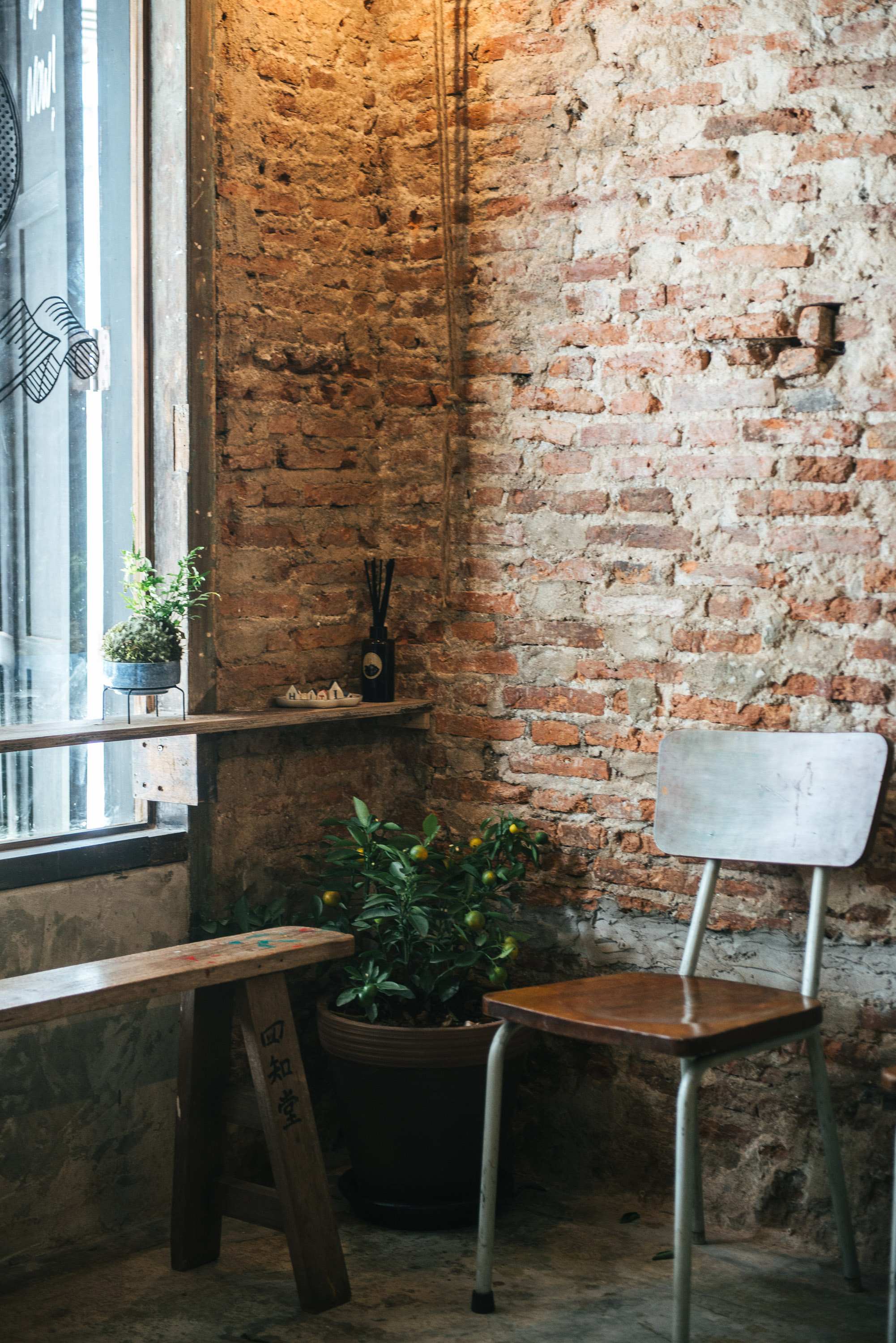 ผนังปูนเปลือยของร้านถูกเขียนด้วยลายมือตัวอักษรภาษาจีนความหมายดี ๆ ที่แปลได้ว่า ‘ขอให้โชคดี’