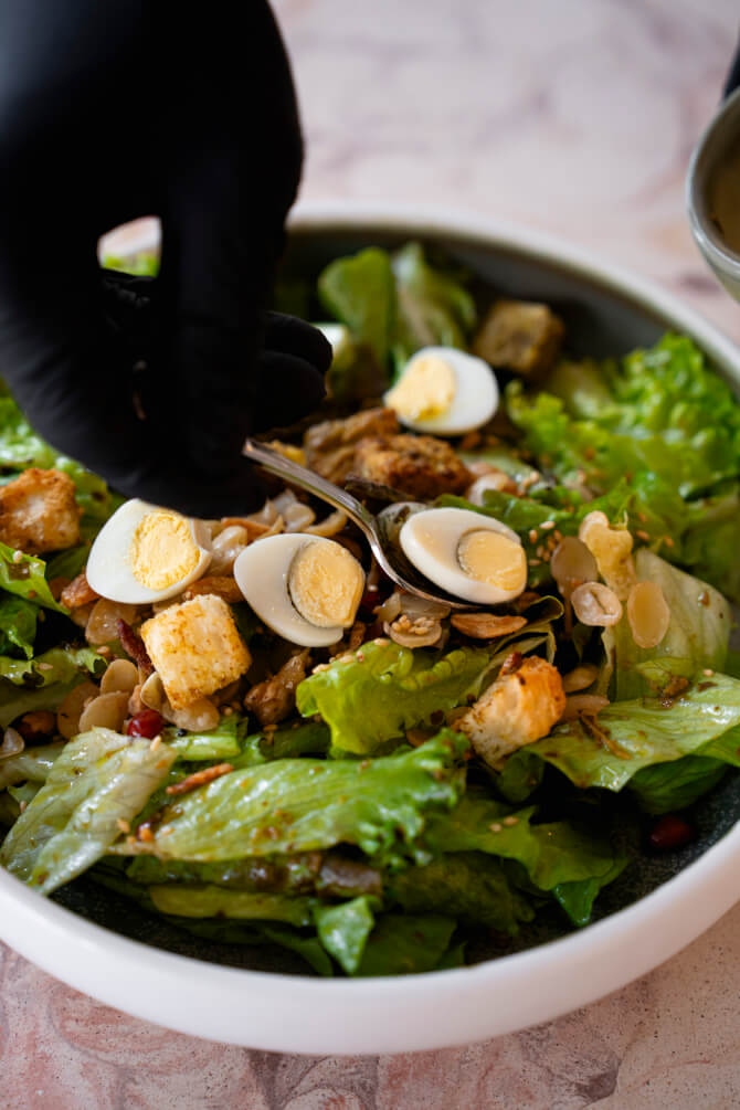 จุดเด่นของสลัดจานนี้คือ การคลุกเคล้าด้วยมือ โดยที่ร้าน HNINN จะผสมใบชากับผักสด เพื่อเพิ่มความสดชื่นและเนื้อสัมผัส มีพนักงานมายืนผสมเครื่องปรุงต่าง ๆ ของสลัดถึงที่โต๊ะ พร้อมอธิบายวัตถุดิบ ส่วนผสมถึง 15 อย่าง บอกได้คำเดียวว่าสลัดจานนี้อร่อยสมกับที่เป็นอาหารประจำชาติจานเด็ดอย่างแท้จริง