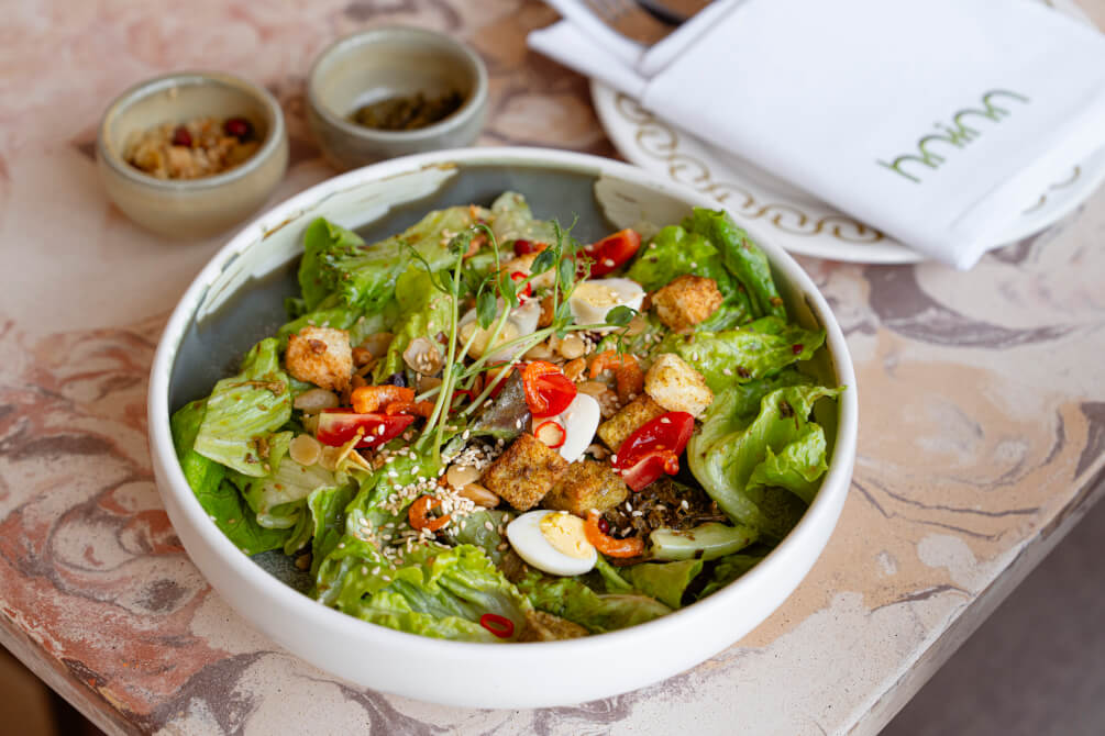 ส่วนใครที่เป็นสายเฮลท์ตี้ อาจลองสั่งเป็นจานสลัดกับเมนูซิกเนเจอร์ที่ชื่อว่า HNINN’S Laphet Thoke (450 บาท) สลัดใบชาหมักรสเข้มข้น ซึ่งถือเป็นอาหารประจำชาติของพม่าด้วยเช่นกัน โดยนำใบชามาทำเป็นสลัด คลุกเคล้ากับถั่วหรือธัญพืชชนิดต่าง ๆ และซอสสูตรพิเศษของทางร้าน ให้รสชาติเข้มข้นเป็นเอกลักษณ์ที่ผสมผสานรสเปรี้ยว เค็ม มัน และเท็กซ์เชอร์กรุบกรอบอย่างลงตัว