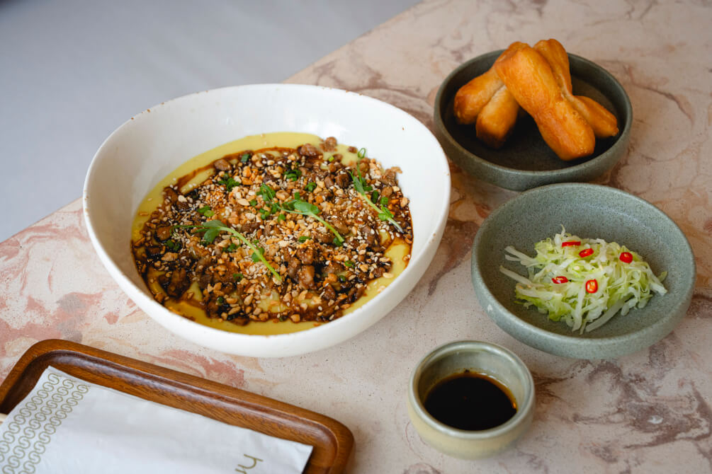 ต่อเนื่องความอร่อยด้วยเมนู Tofu Nway (350 บาท) อีกหนึ่งเมนูอาหารเช้าจากรัฐฉาน ทำจากเต้าหู้ถั่วลูกไก่เนื้อนุ่มลื่น เสิร์ฟคู่กับเส้นก๋วยเตี๋ยวตามแบบดั้งเดิม พร้อมเติมความร่วมสมัยด้วยการใช้เส้นราเมนนุ่ม ๆ เข้ากันดีกับเต้าหู้หวานละมุน เนื้อฉ่ำ ๆ (สามารถเลือกวัตถุดิบได้ 3 แบบ ได้แก่ เนื้อไก่, เนื้อหมู และวีแกน) ที่ให้ความอร่อยแบบครบรส เคียงคู่ความอร่อยมากับปาท่องโก๋ฉีกและน้ำมันพริกเผาตัดรสเลี่ยน
