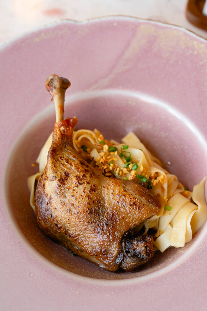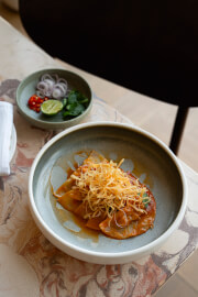 หรือจะจัดเต็มด้วยอาหารจานหลักอย่าง C Chat Khout Swal with Duck Confit (500 บาท) เป็ดกงฟีต์กับเส้นพาสต้า Tagliatelle ที่ทางร้านเลือกใช้แทนเส้นบะหมี่ ซึ่งชาวพม่านิยมรับประทานกับไก่นึ่ง ซี่โครงหมูนึ่ง หรือเป็ดนึ่ง ทางร้านจึงเลือกสร้างความแตกต่างที่ร่วมสมัยให้เมนูนี้น่าสนใจมากขึ้น ด้วยการเลือกใช้เป็ดกงฟีต์ที่ปรุงในรูปแบบอาหารฝรั่งเศส เพื่อให้ได้เนื้อสัมผัสที่กรอบนอกนุ่มใน เพิ่มความพรีเมียมให้มากกว่าที่เคย