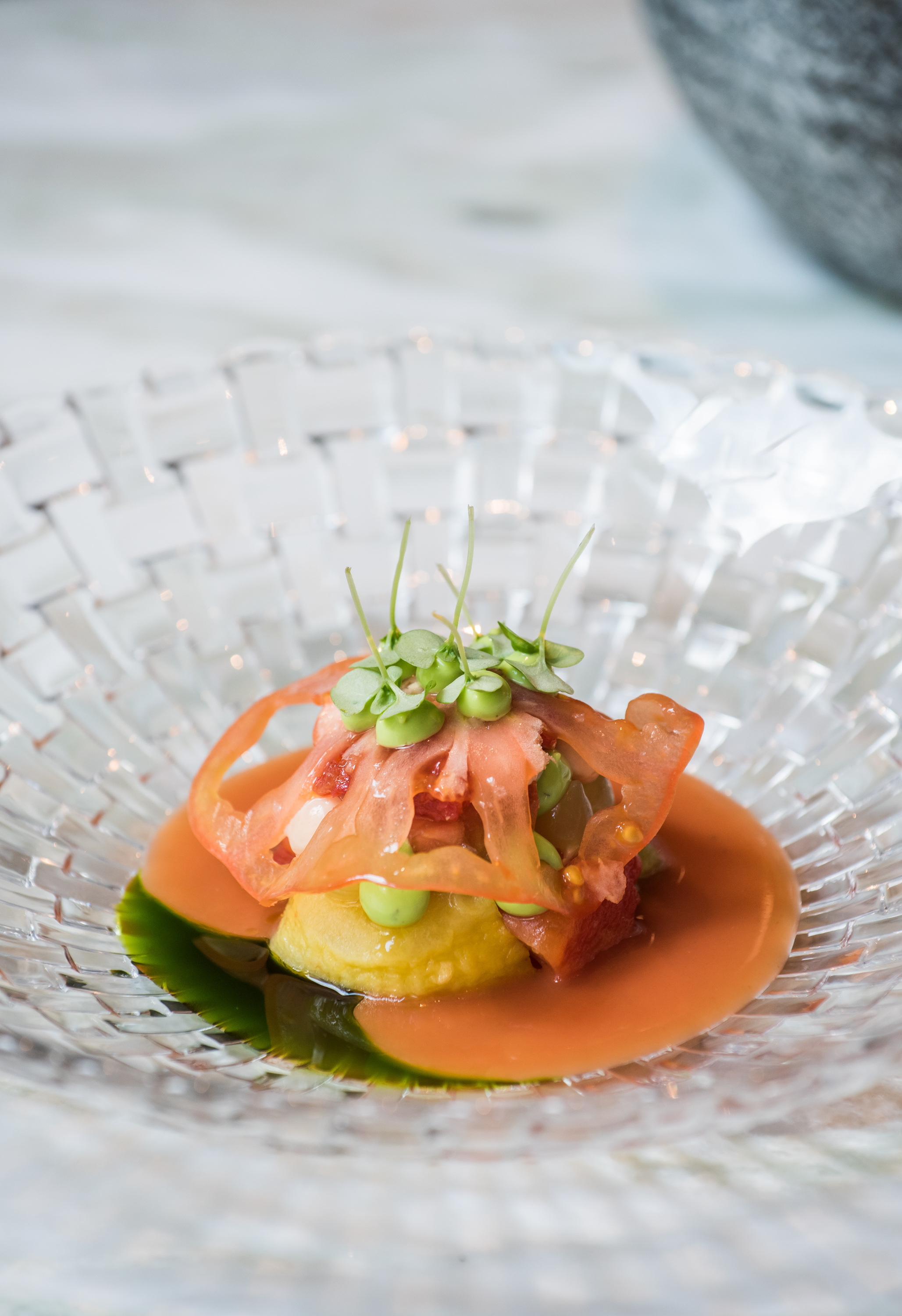 ต่อด้วยจานที่ถูกตกแต่งมาอย่างสวยงามอย่าง Sea bass - Radish - Dill เซวิเช่เนื้อปลากะพงแล่บาง ท็อปหน้าด้วยแรดิชสไลซ์ และ Dill Cream เป็นจานที่ให้รสชาติเปรี้ยวนำ ทานแล้วสดชื่น ตามด้วย Tomatoes - Chive - Dill ชูวัตถุดิบหลักอย่าง มะเขือเทศ ที่มีทั้งแบบ Sun-dried tomatoes, Semi-dried tomatoes, มะเขือเทศสด, เดรสซิ่งมะเขือเทศ และ Chive Oil เป็นจานที่ได้รสชาติของมะเขือเทศเต็ม ๆ และ Hamachi - Celery - Smoked เนื้อปลาฮามาจิชิ้นหนารมควันด้วยไม้ Applewood ท็อปด้วยพริกไทยดำ ทานคู่กับขึ้นฉ่ายฝรั่ง เพิ่มรสสัมผัสด้วยข้าวเกรียบปลา และซอสอะโวคาโด เนื้อปลานุ่มรสกลมกล่อมเข้ากับซอสอะโวคาโดรสละมุน