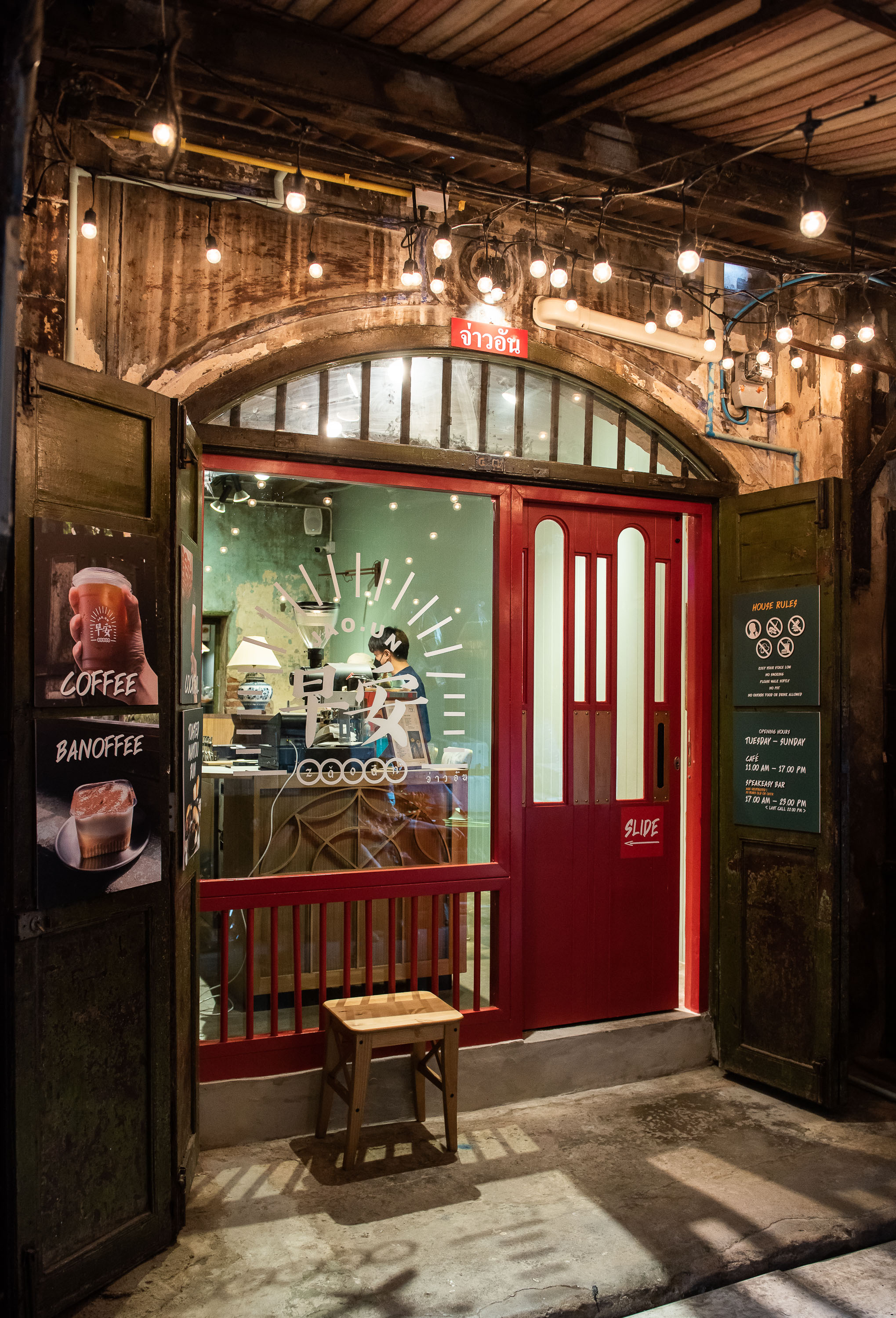 ด้วยตึกแถวโบราณตั้งแต่สมัยรัชกาลที่ 5 ถูกส่งต่อเรื่องราวมายังรุ่นสู่รุ่น ทำให้ที่นี่เต็มไปด้วยบรรยากาศความคลาสสิกที่ยังคงสถาปัตยกรรมและโครงสร้างเดิมเอาไว้ นับตั้งแต่ทางเข้าก็เชิญชวนให้เราอยากเข้าไปสัมผัสบรรยากาศด้านในด้วยประตูสีแดงสะดุดตา ทันทีที่เดินเข้ามาก็สัมผัสได้ถึงกลิ่นอายความเป็นจีนที่ผสมผสานกันได้อย่างลงตัว โดยมีมุมเคาน์เตอร์บาร์ด้านล่างที่พร้อมต้อนรับทุกคนด้วยความอบอุ่น นอกจากนี้ยังมีพื้นที่ชั้นบนให้เลือกนั่งกันได้อย่างสบาย ๆ ท่ามกลางบรรยากาศสุดผ่อนคลายด้วยการเปิดรับแสงธรรมชาติจากหน้าต่าง และอีกหนึ่งไฮไลต์ของทางร้านคือการเปลี่ยนเป็น Speakeasy Bar ในยามค่ำคืน ให้คุณได้จิบเครื่องดื่มเพลิน ๆ เคล้าคลอด้วยเสียงเพลงเพราะ ๆ อีกด้วย