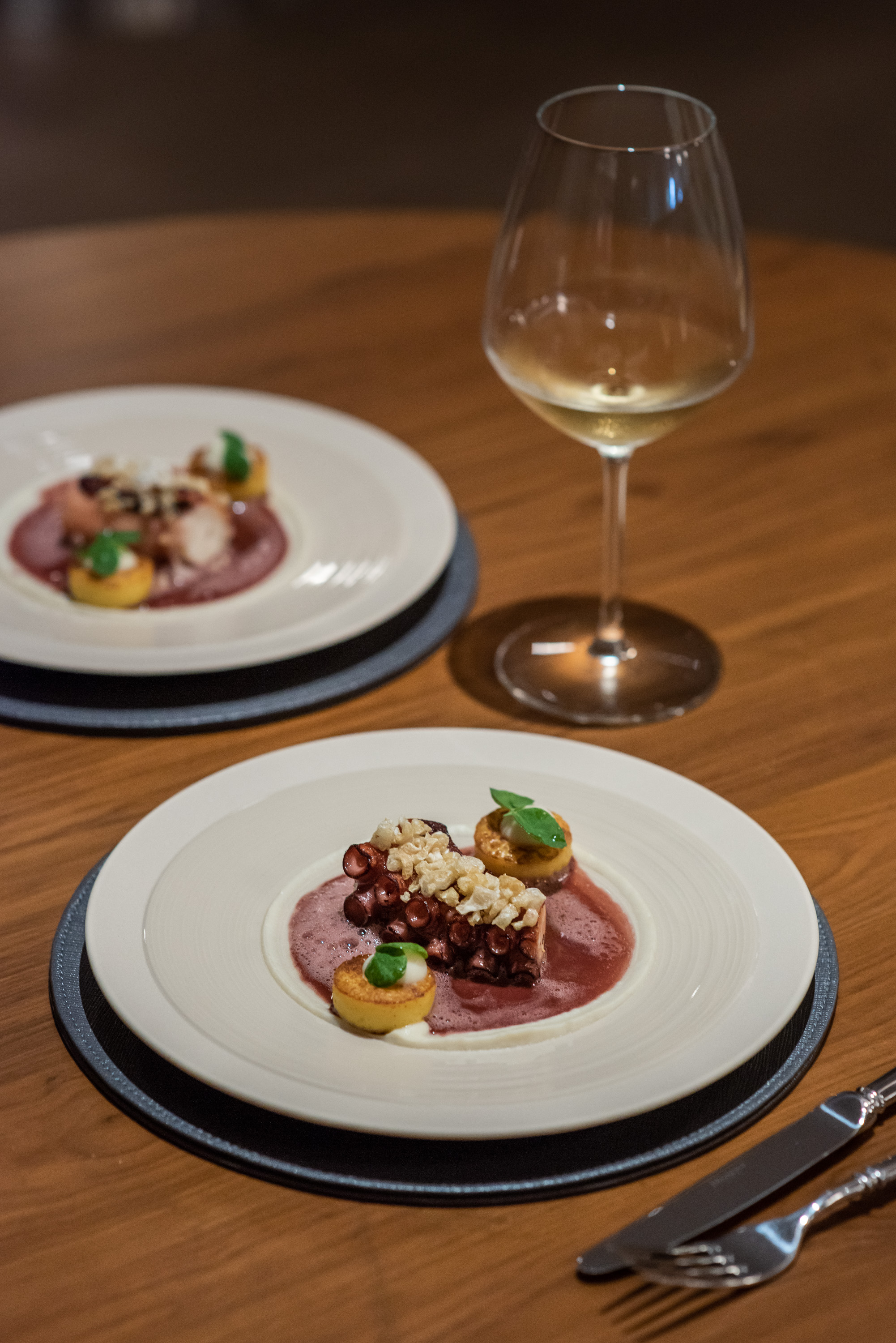 คอร์สที่สอง เชฟเลือกเสิร์ฟเมนู Charred Galician Octopus หนวดปลาหมึกยักษ์ที่ปรุงมาอย่างดี ได้เนื้อนุ่มไม่เหนียว ทานคู่กับ ซอส Red Wine Butter, Celeriac และ Polenta หรือจะเลือกเป็น Berliner Senfei เมนูสัญชาติเยอรมัน ทำจากมันฝรั่งรมควัน ท็อปด้วย ซอสบีทรูทดอง เสิร์ฟคู่กับ Oscietra Caviar ที่มีรสเค็ม ตัดกับรสเปรี้ยวของบีทรูทดองสำหรับเมนคอร์ส ใครที่ชอบซีฟู้ด แนะนำให้เลือกเมนู Atlantic Cod Fish สเต๊กปลาค้อด ทานคู่กับซอสที่มีส่วนผสมของผักโขม, ถั่วแระญี่ปุ่น, มะเขือเทศ, เบคอนรมควันสไตล์อิตาเลียน และซอส Thyme Veloute หรือจะเลือกสั่งเมนู Charred Nakornpathom Pork Jowl สเต๊กเนื้อหมูส่วนแก้มด้านบนที่ได้จากฟาร์มในจังหวัดนครปฐม เสิร์ฟคู่กับ Yellow Chive Puree, มะม่วง และซอสรสเข้มข้นที่ได้จากการเคี่ยวกระดูกหมู
