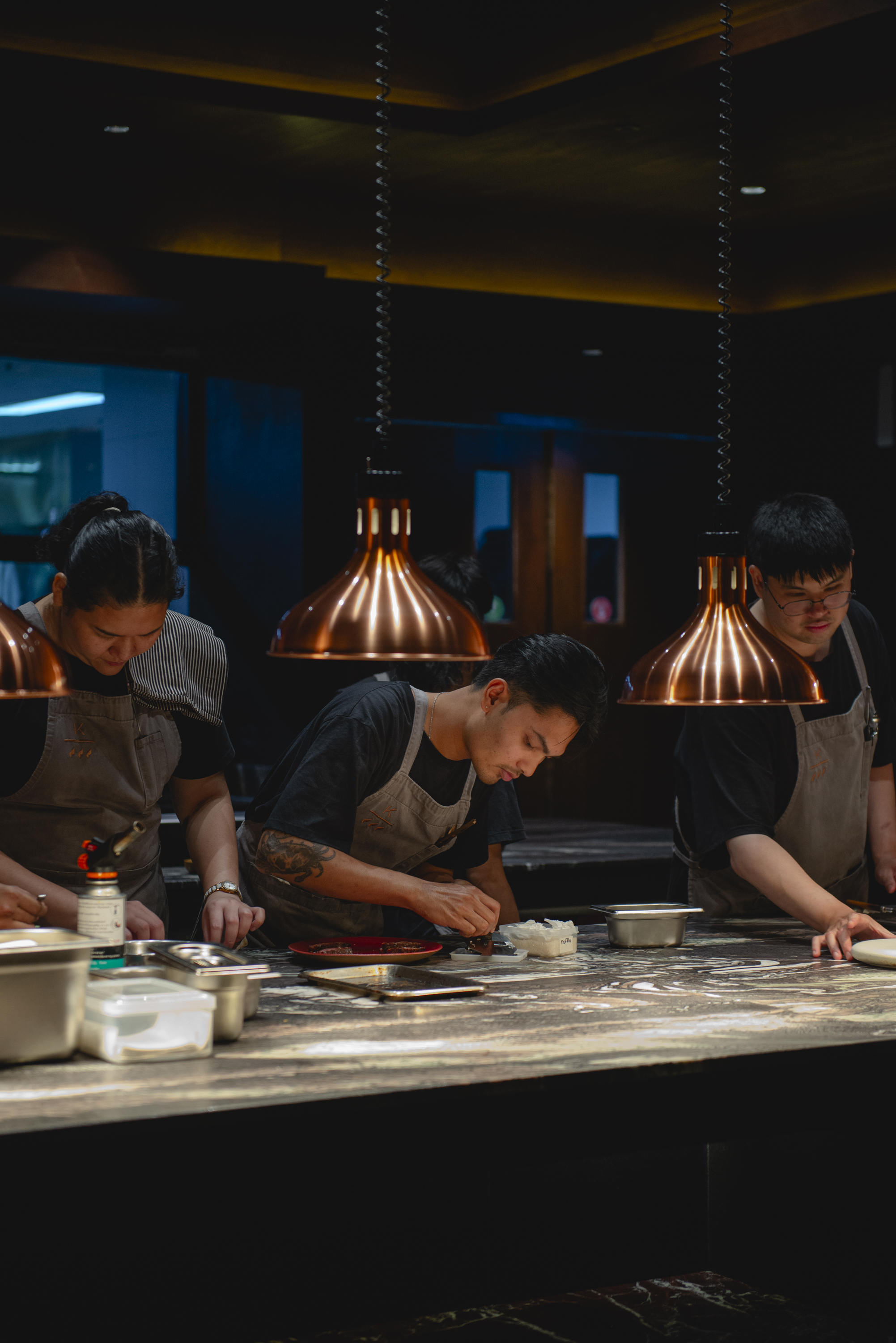 ในเรื่องของบรรยากาศที่นี่เน้นใช้โทนสีส้ม - ดำ เพิ่มมิติและบรรยากาศที่เรียบหรูด้วยการเลือกใช้ไฟในจุดต่าง ๆ มุมที่นั่งถูกจัดวางได้อย่างไม่อึดอัดและเป็นส่วนตัว มีส่วนหน้าบาร์ที่พร้อมเสิร์ฟเครื่องดื่มแก้วพิเศษ ส่วนของครัวเป็นแบบ Open Kitchen พร้อมให้ทุกคนได้ชมบรรยากาศการทำอาหารได้แบบเพลิน ๆ