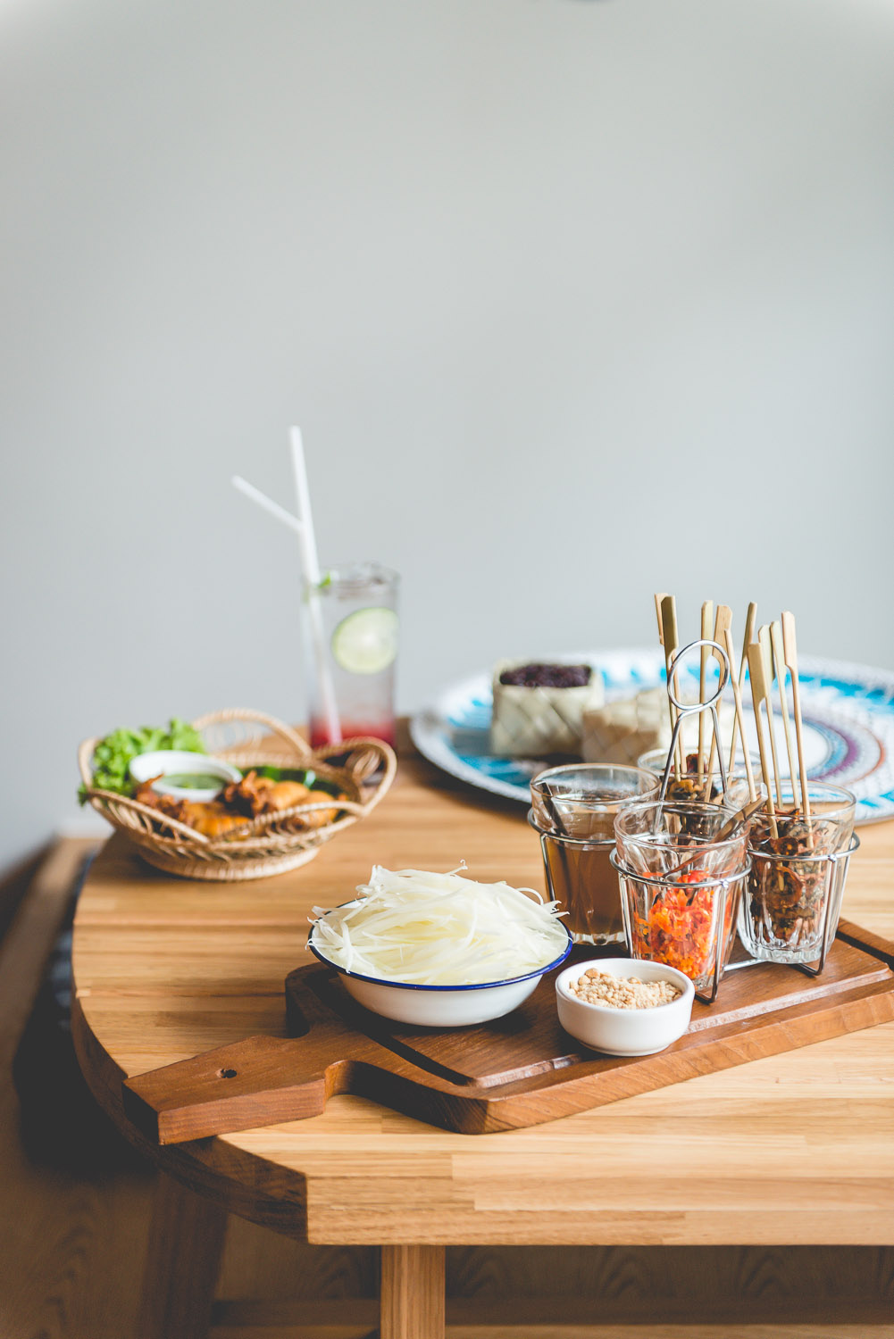 อินทีเรียของที่นี่ซ่อนความหมายและความสนุกสนานไว้มากมายโดยเป็นฝีมือของบริษัทดีไซน์เล็ก ๆ ที่ชื่อว่า 67 Studio ร้านตกแต่งโดยเล่นกับองค์ประกอบต่าง ๆ ได้เป็นอย่างดี เช่น พริกแห้งที่แขวนประดับ สังกะสีสีพาสเทล ถาดอาหารที่เรามักเห็นตามวัด หรือปลอกหมอนที่ลายคล้ายกับผ้าถุงที่คนไทยชินตาแต่กลับแลดูกลมกลืนกับความโมเดิร์นของร้านโดยรวม ใครรู้ตัวว่านั่งชิลล์ยาว เลือกนั่งที่ชั้นสองจะมีโต๊ะเตี้ยและเบาะรองนั่งกับพื้นรออยู่