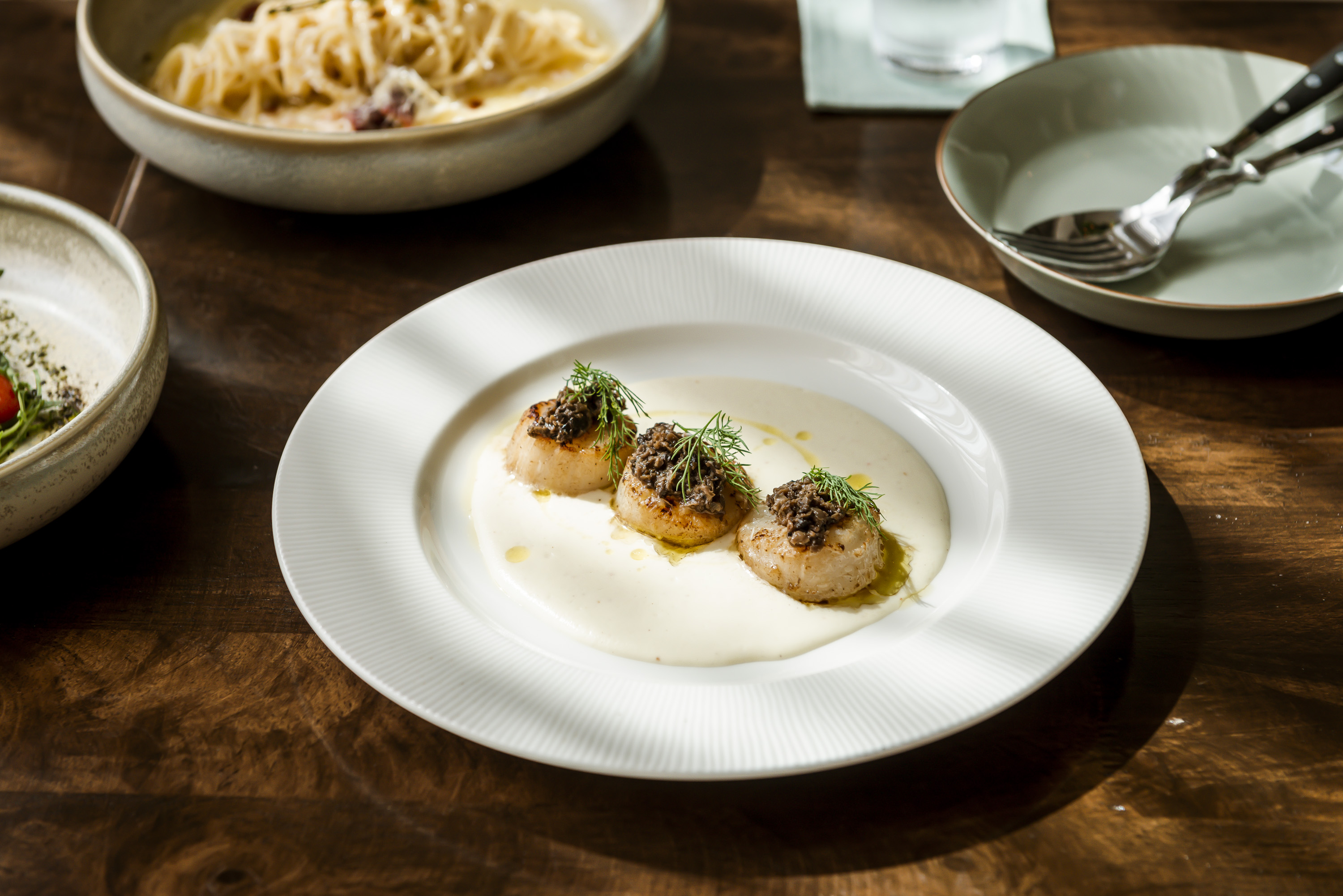 มาแล้วแนะนำให้เริ่มจากจานทานเล่นตัวไฮไลต์ของร้านอย่าง Burrata Cheese (240 บาท) บูราต้าชีสสุดครีมมี เคียงมากับ Wild Rocket และ Pickle Cherry Tomato ที่เชฟลงมือดองเอง ได้รสหวาน เท็กเจอร์หนึบ ทานง่าย เข้ากันเป็นอย่างดี หรือจะเป็น Cauliflower Scallops (290 บาท) ก็น่าสนใจไม่แพ้กัน จานนี้เสิร์ฟหอยเชลล์ตัวโตที่ผ่านการ Pan-Seared มากรุ่น ๆ เข้ากันเป็ยอย่างดีกับซอสของทางร้าน ได้กลิ่นหอม ๆ ของ Dill ไปพร้อมกันในคำเดียว