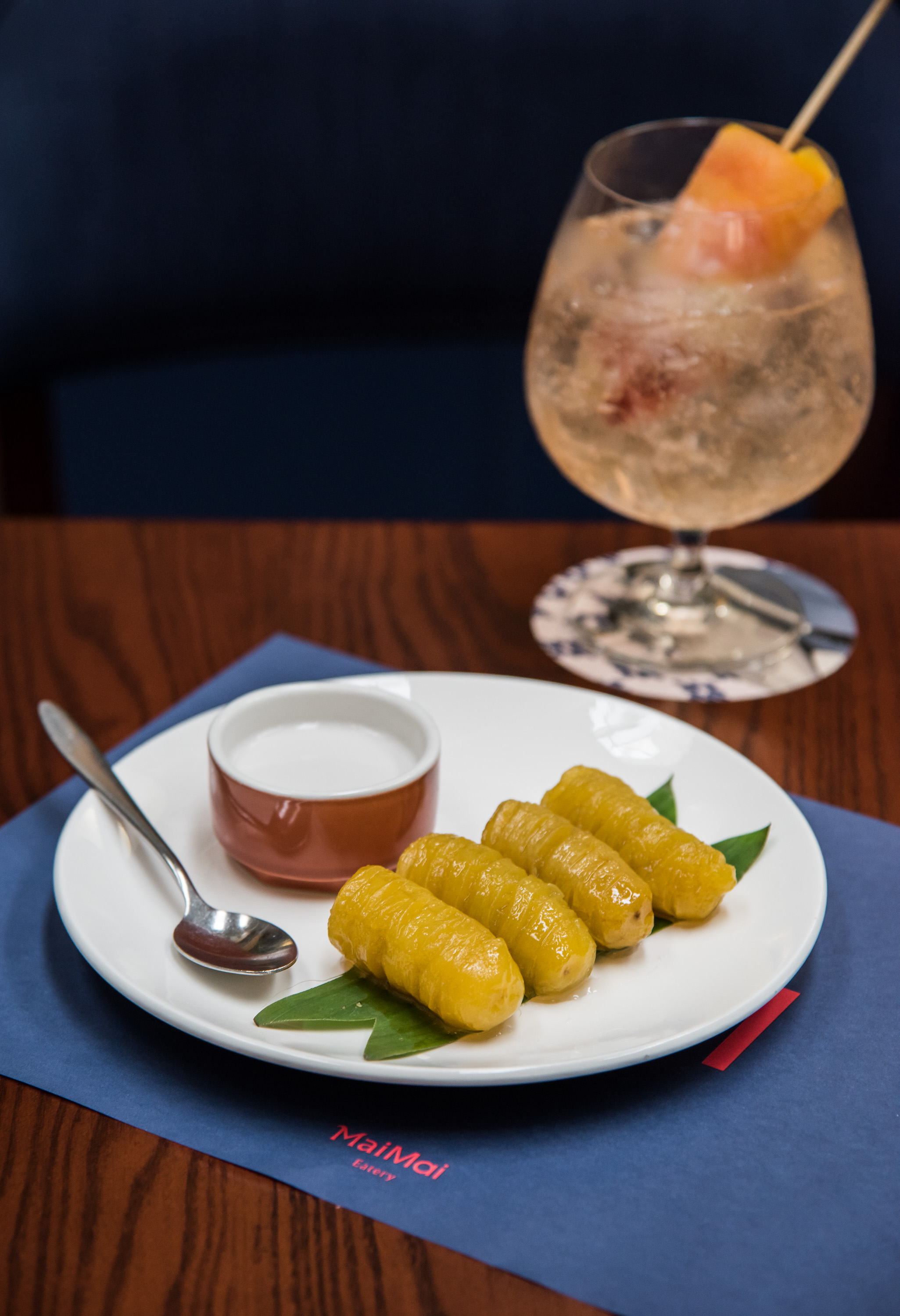 ปิดท้ายด้วยเครื่องดื่มและของหวานที่โดดเด่นไม่แพ้ใครด้วย กล้วยไข่เชื่อม (80 บาท) เมนูชูโรงของร้าน เพราะเป็นเมนูขนมโบราณแสนคลาสสิกที่ต้องใส่ใจในทุกรายละเอียดตั้งแต่การเลือกกล้วยไข่คัดพิเศษจากจังหวัดเพชรบุรี ทำให้เมื่อผ่านการเชื่อมแล้วจะได้สัมผัสที่ชุ่มฉ่ำเข้าเนื้อ ทานคู่กับน้ำกะทิเข้มข้นรสเค็ม ตัดรสหวานเป็นอย่างดี หรือจะเป็น เครมบรูเล่มะพร้าวอ่อน (180 บาท) เมนูที่ดัดแปลงมาจาก คัสตาร์ด โคโคนัท เมนูโปรดคุณยาย เมนูนี้เสิร์ฟมาในลูกมะพร้าว ด้านบนเป็นน้ำตาลที่ถูกพ่นด้วยไฟจนกลายเป็นคาราเมลสีน้ำตาลสวย ให้สัมผัสเนียนนุ่มละมุนลิ้น ทานได้เพลิน ๆ