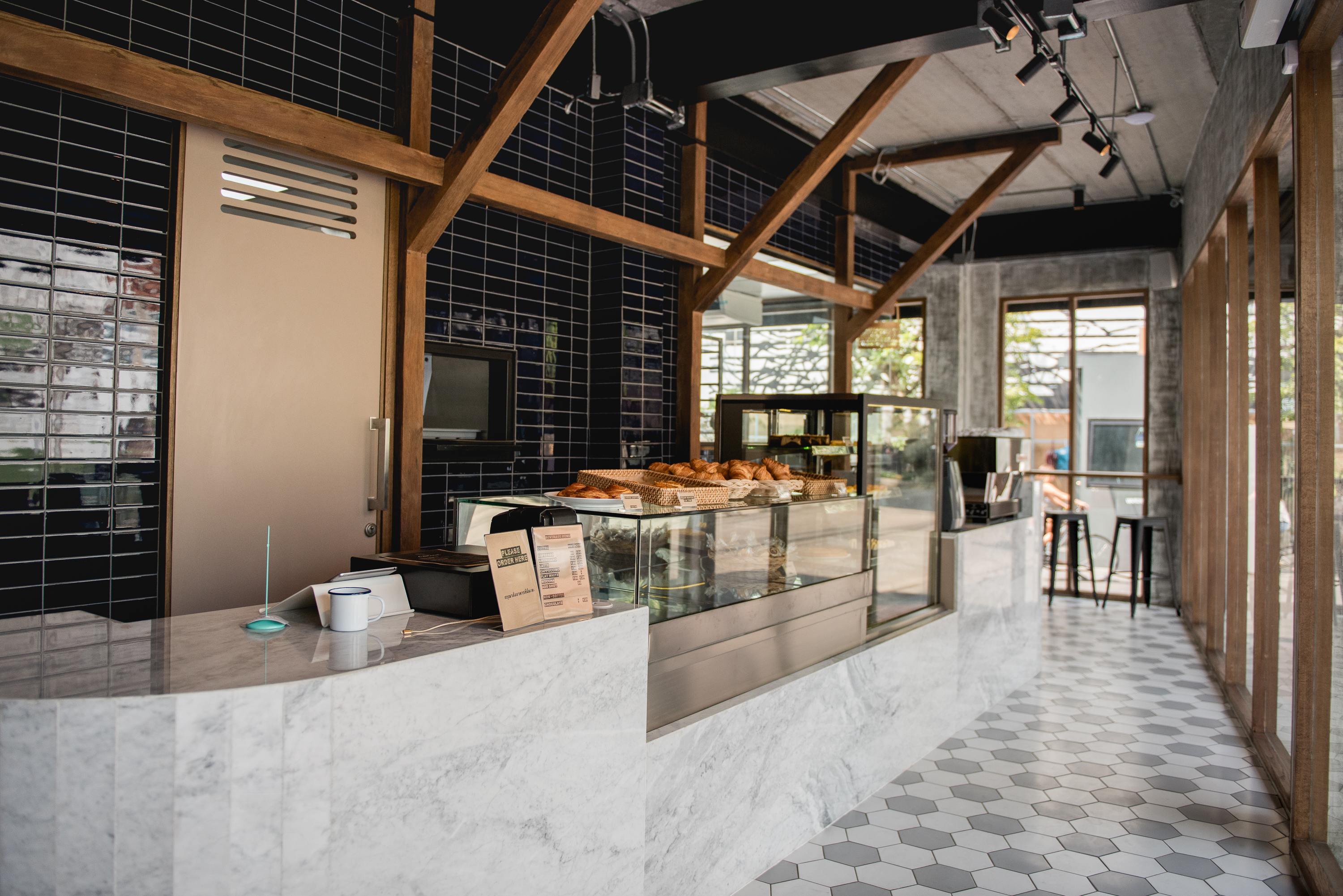 ตัวร้านแบ่งออกเป็น 2 ชั้น บริเวณชั้นล่างจะเป็นโซนครัวสำหรับทำเพสทรีขนาดใหญ่และโซนเพสทรีช็อป ส่วนบนชั้นสอง จะเป็นโซนที่นั่งสบาย ๆ มีโต๊ะไม้ยาวให้นั่งกันได้หลายคน ตกแต่งด้วยโครงไม้ พื้นหินขัด และผนังสีเทา ให้ความรู้สึกเรียบง่ายเหมือนมานั่งทานขนมที่บ้านเพื่อน แต่แฝงบรรยากาศอบอุ่นด้วยเฟอร์นิเจอร์ไม้และหน้าต่างบานใหญ่ที่รับแสงสว่างจากภายนอกได้ดี