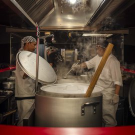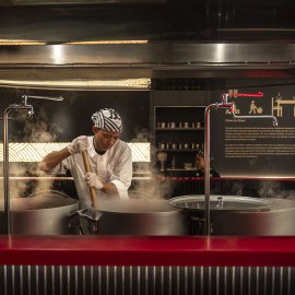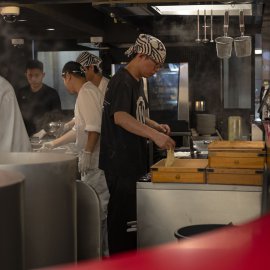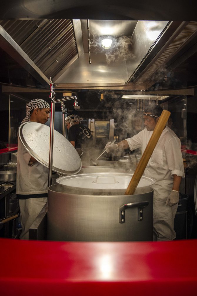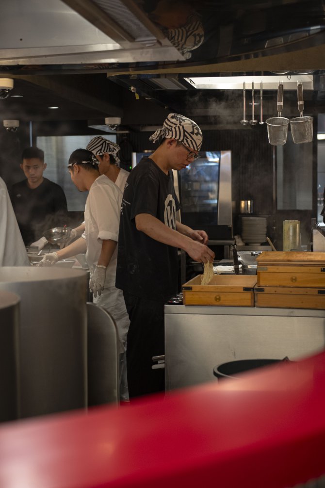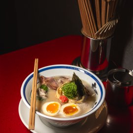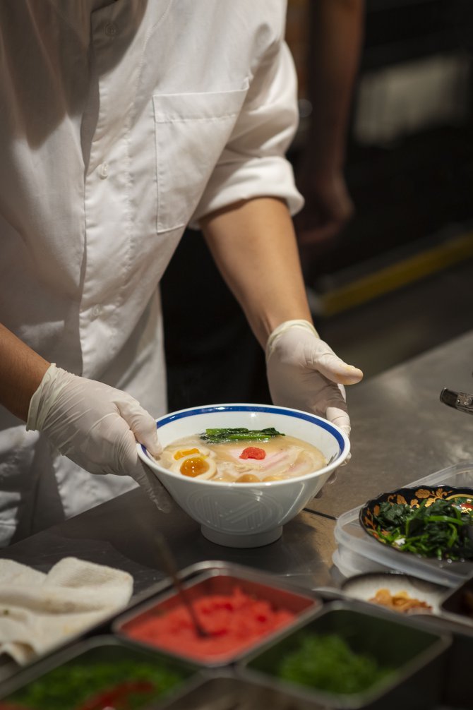 ในด้านบรรยากาศ ร้านมาในสไตล์ Modern Japanese ที่เรียบ เท่ และแฝงความจริงจังไว้ในทุกดีเทล โดยมีเคาน์เตอร์บาร์ทรงตัว U เป็นจุดเด่น โอบล้อมครัวกลางและหม้อเคี่ยวน้ำซุปที่เปิดให้เห็นทุกขั้นตอนแบบใกล้ชิด ตั้งแต่การเตรียมเส้นไปจนถึงการเสิร์ฟชามตรงหน้า เสริมด้วยดีไซน์ชามโทนดำ-ขาวตัดด้วยตัวอักษรสีทองที่ช่วยขับให้ซุปโดดเด่นยิ่งขึ้น ทั้งหมดถูกออกแบบมาเพื่อให้ “ชามราเมง” เป็นศูนย์กลางของประสบการณ์ ที่เริ่มต้นตั้งแต่ก้าวแรกที่เดินเข้ามา ผ่านแสงไฟอุ่น ๆ และจังหวะการทำงานของเชฟที่ค่อย ๆ เล่าเรื่อง Tonkotsu ออกมาอย่างเรียบง่าย แต่เต็มไปด้วยรายละเอียดและความตั้งใจ