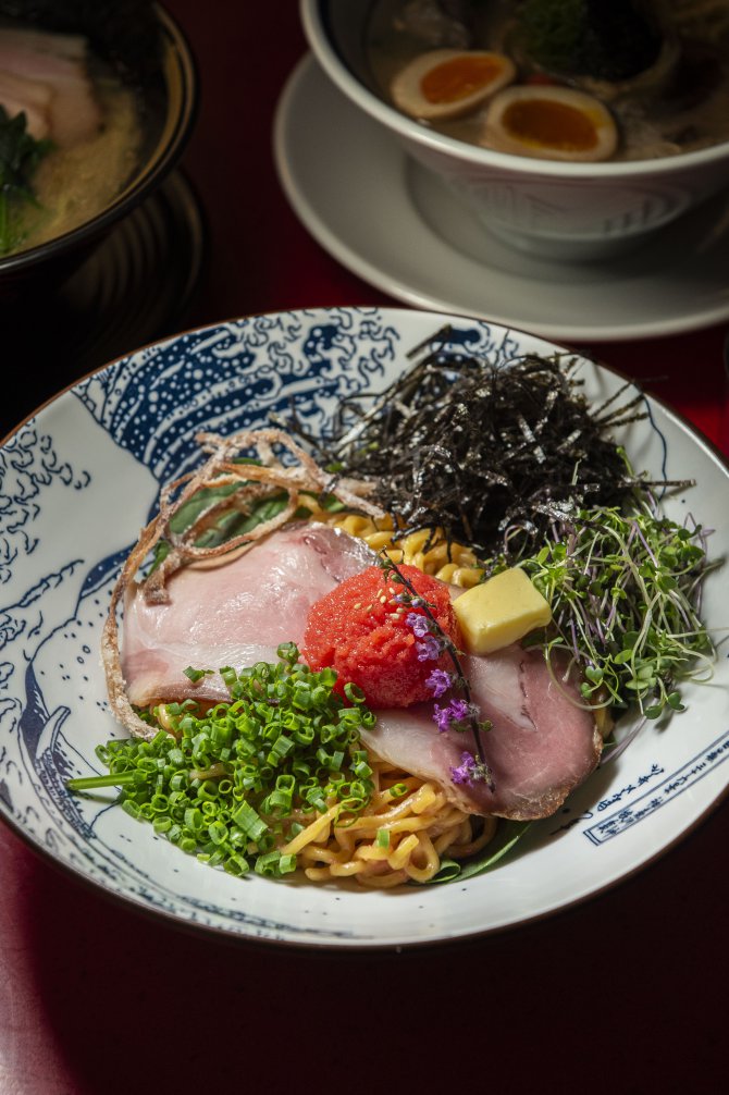 อีกจานขายดีต้องยกให้ Mentaiko Butter Aburasoba with Iberico Pork (490 บาท) ราเมงแบบแห้งที่โดดเด่นด้วยเส้นสูตรพิเศษจากการผสมแป้งสาลีเข้ากับโมจิ ทำให้ได้สัมผัสที่หนึบ เด้ง และมีความยืดหยุ่นเฉพาะตัว เมื่อคลุกเคล้ากับซอสเข้มข้น ชามนี้รวมรสชาติอูมามิของเมนไทโกะและเนยเข้ากับหมู Iberico ได้อย่างลงตัว ให้รสชาติที่เข้มข้นแต่กลมกล่อม