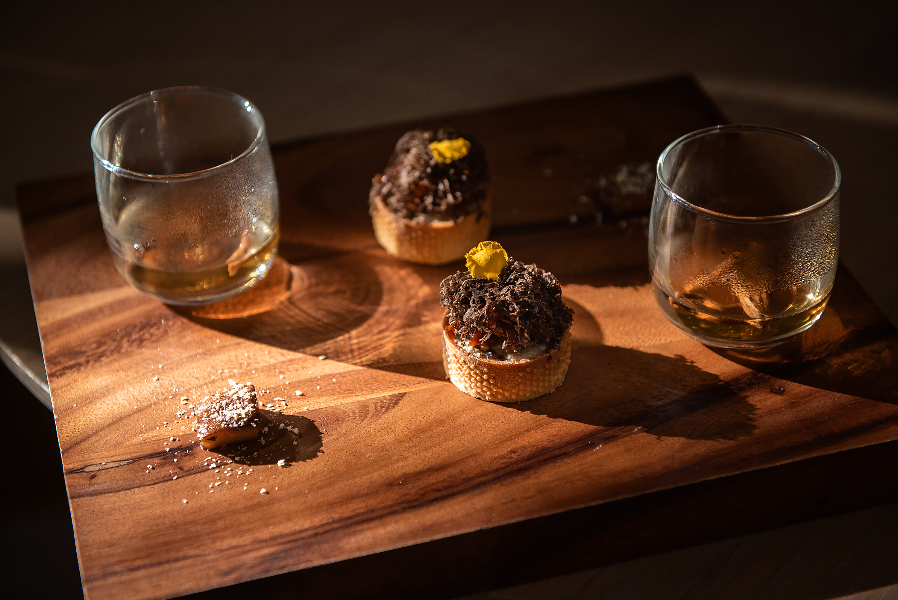 เริ่มต้นกันที่เมนู Mushroom จานรองท้องที่จะเสิร์ฟเห็ด 3 แบบ โดยเริ่มคำแรก เชฟใช้เห็ดพอร์โทเบลโลอินฟิวส์ในน้ำมันเป็ด 2 วันจนเข้าเนื้อ ได้ความหอมและอูมามิ เสิร์ฟมาพร้อมกันกับเม็ดมะม่วงหิมพานต์ คำถัดมาเป็นทาร์ตเห็ดสอดไส้มูสเห็ดแชมปิญองผสมกับแบล็กทรัฟเฟิล ท็อปด้านบนด้วยเห็ดหูหนูยำกับซอสโคชูจัง ท็อปด้านบนอีกครั้งด้วยแบล็กทรัฟเฟิล ปิดที่คำสุดท้ายอย่างชาเห็ดร้อน ๆ ที่มีส่วนผสมของเห็ด 5-6 ชนิด ให้รสชาติบางเบาแต่หอมกลิ่นเห็ดอย่างชัดเจน เสิร์ฟกับเห็ดแห้งชิเมจิ