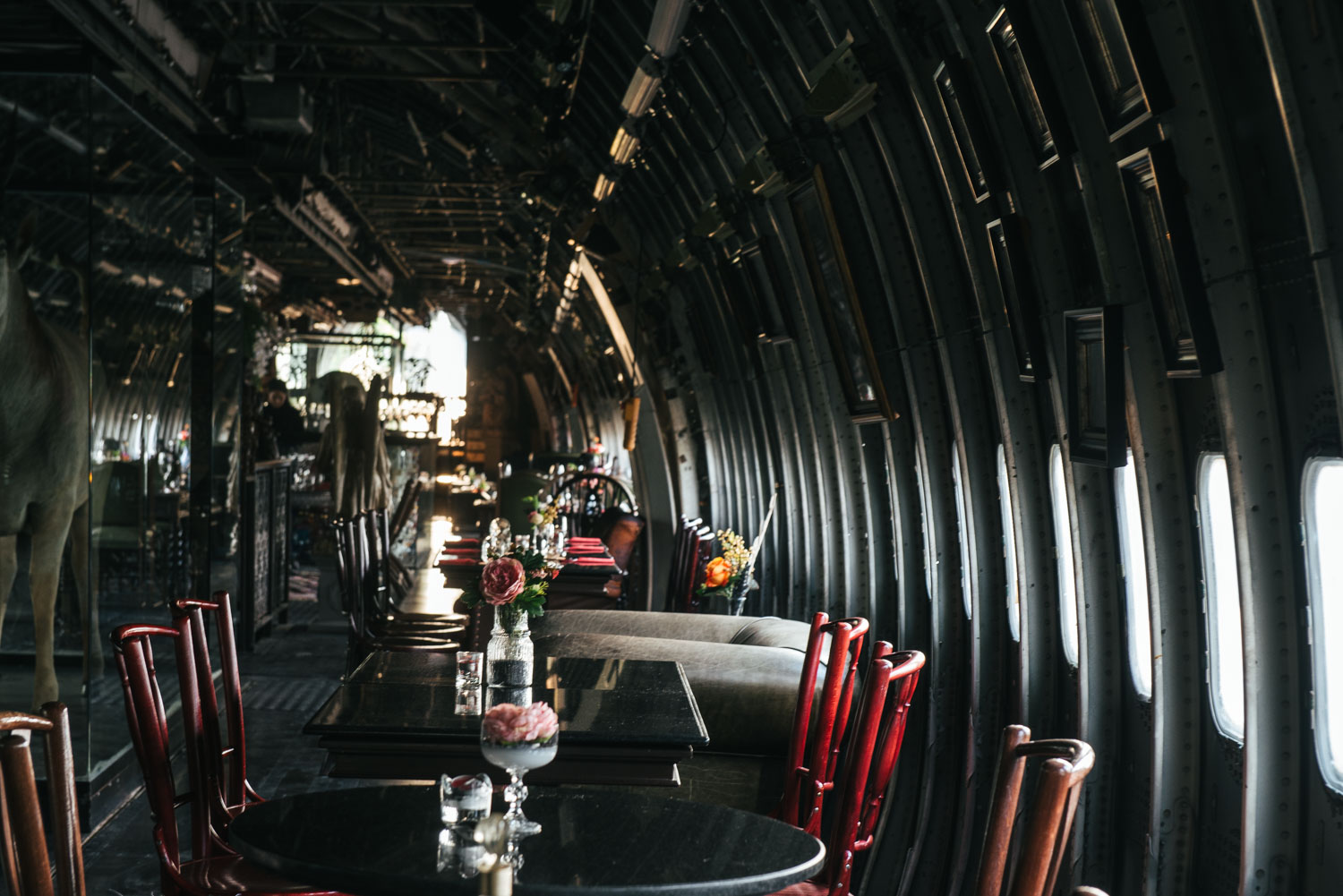การจะเข้าสู่เครื่องบินลำนี้ ทุกคนที่เข้ามาทานต้องเดินผ่านลิฟท์เก่าแสนคลาสสิกขึ้นมา พร้อมร่วมตื่นตาตื่นใจไปกับการตกแต่งภายในของทางร้านที่เลือกนำเสนอในคอนเซ็ปต์ของโบราณเลอค่าน่าสะสมมาให้ได้ชมกัน หลากหลายโซนนั่งถูกครีเอทขึ้นมาจากของตกแต่งบางชิ้น บ้างก็มาจากเฟอร์นิเจอร์เก่าที่นำเข้าจากทั่วโลก โดยร้าน Na-Oh Bangkok ได้มีการจัดสรรพื้นที่บนเครื่องบินลำนี้ไว้ได้อย่างคุ้มค่า ส่วนมุมไฮไลต์ของที่นี่ ขอยกให้แก่เหล่าสัตว์สตัฟฟ์หายากจากทั่วทุกมุมโลกที่มาร่วมสร้างบรรยากาศการรวมตัวกันบนเรือช่วยชีวิตแห่งนี้ เรียกได้ว่าเป็นบรรยากาศการทานมื้อเย็นที่แปลกใหม่ไม่เหมือนที่ไหนเลยจริง ๆ