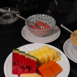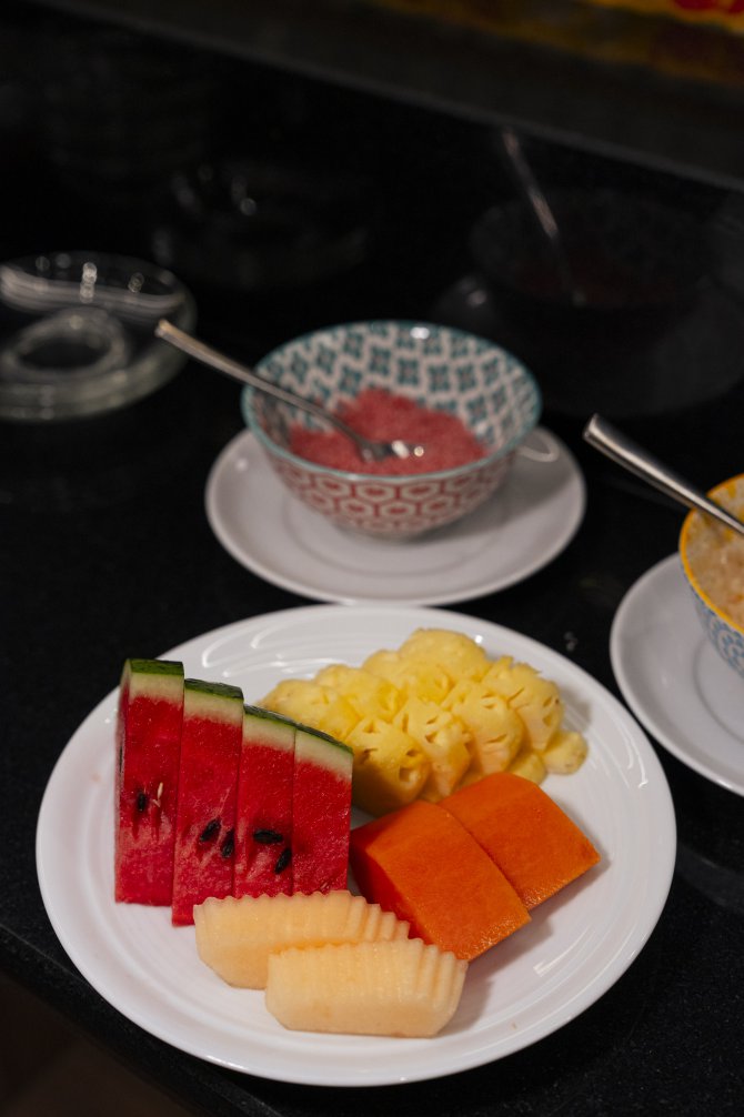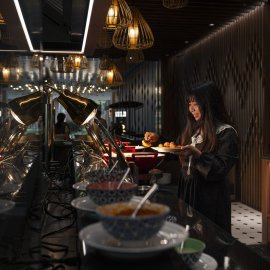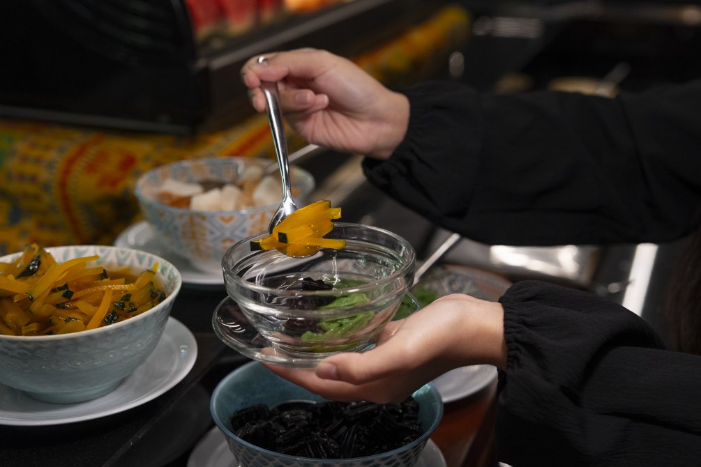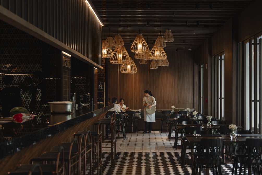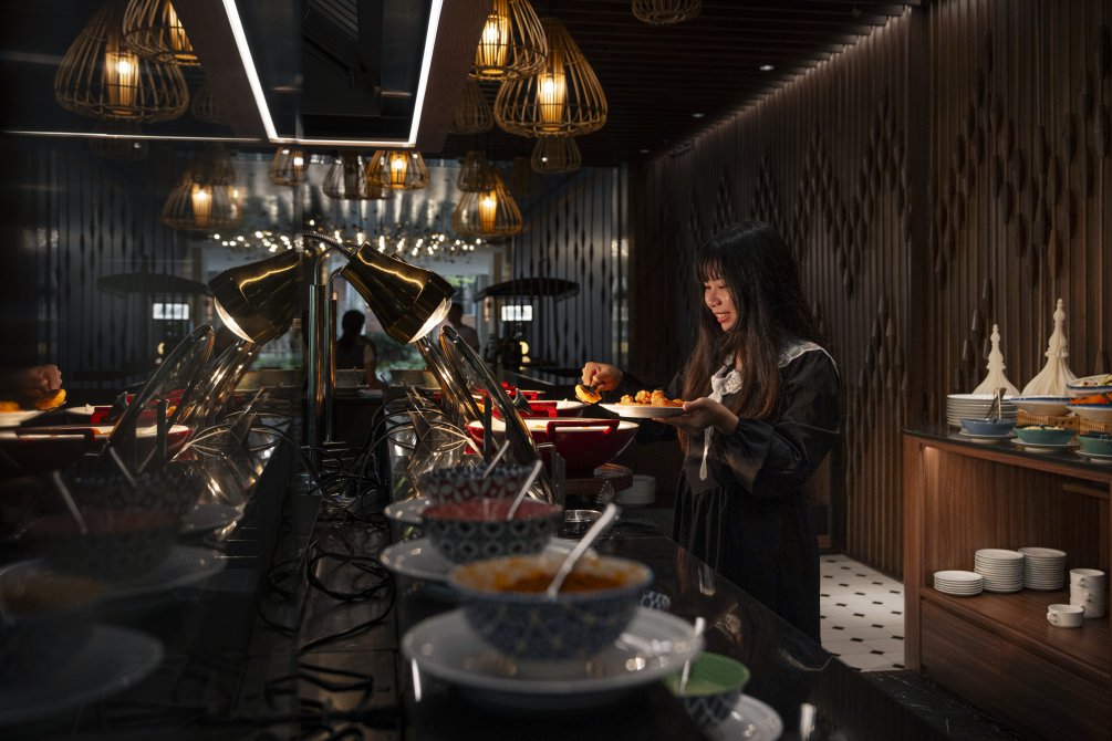 ส่วนกลางของห้องอาหารจะเป็นสเตชันบุฟเฟ่ต์ให้แขกที่มาได้เลือกตักอาหารได้ตามชอบ โดยมีทั้งของทานเล่น ขนมหวาน สลัดบาร์ และบาร์น้ำให้เลือกชิมกัน ส่วนด้านข้างเป็นมุมโต๊ะที่นั่ง สามารถเลือกมุมส่วนตัวได้ตามชอบ