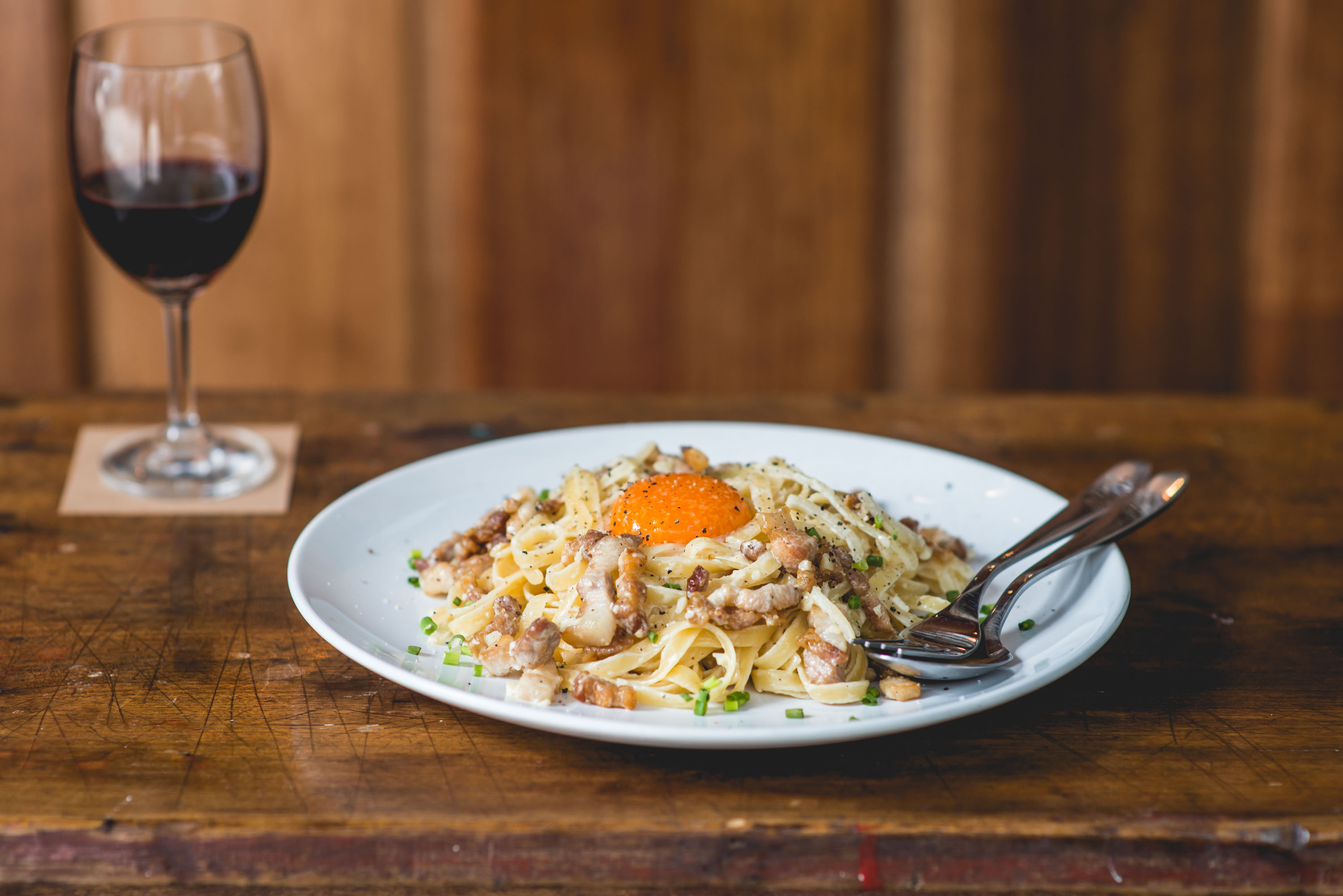ถัดมาเป็นเมนูเส้น Creamy Carbonara Fettuccini with Yellow Duck Egg on Top (295 บาท) เส้นเฟตตูชินีผัดครีมซอสและหมูสามชั้น ท็อปด้วยไข่แดงเยิ้ม ๆ