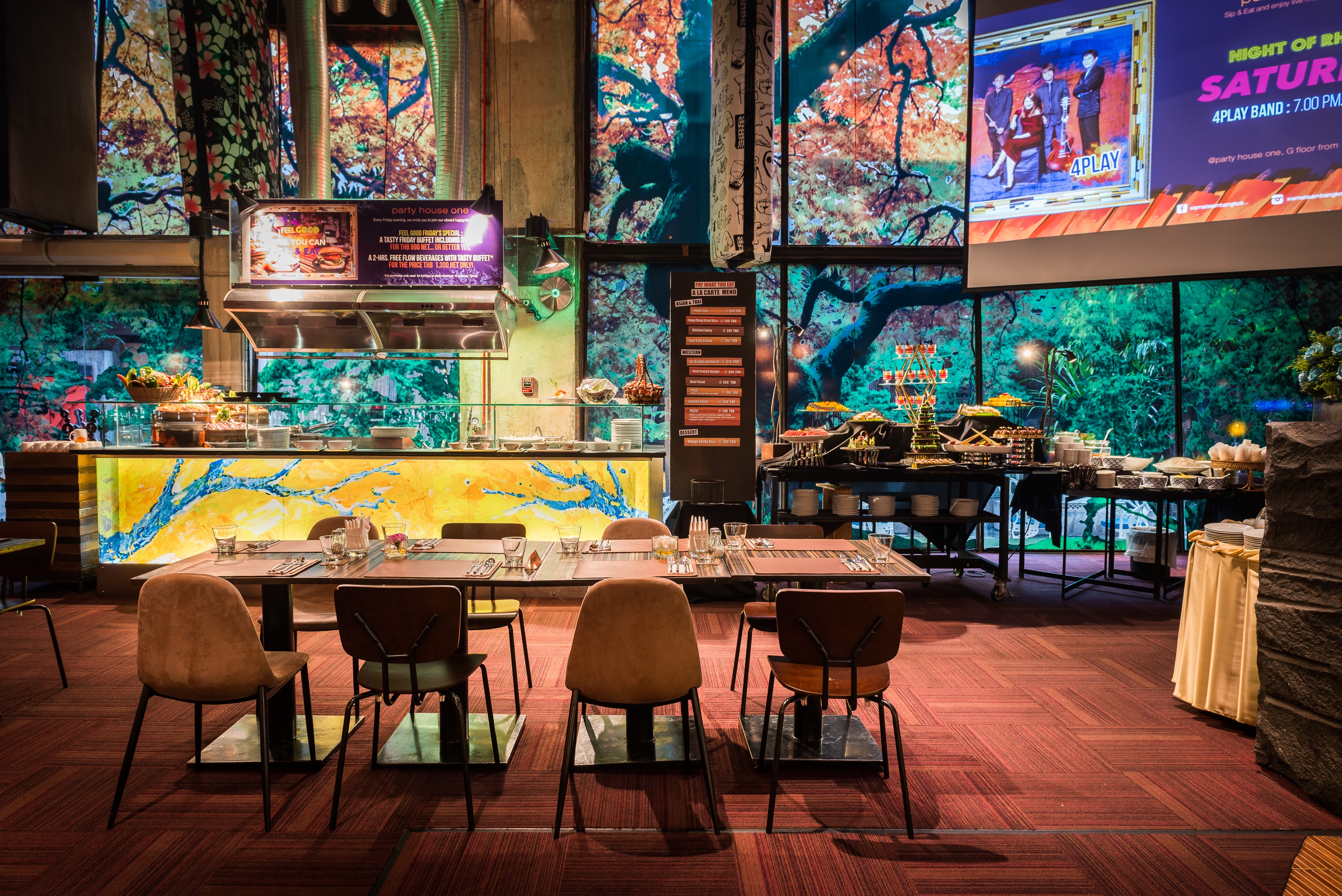 Party House One เป็นห้องอาหารที่มาพร้อมกับคอนเซ็ปต์หลักคือ Everyday is Party เพราะฉะนั้นบรรยากาศภายในจึงเน้นโทนสีสันสดใส อีกทั้งยังเพิ่มความดิบเท่เข้าไปด้วยการตกแต่งในสไตล์ Industrial Loft ซึ่งเน้นการใช้วัสดุจากภาคอุตสาหกรรม อาทิ ผนังปูนเปลือย ไม้ อิฐ และท่อเหล็กต่าง ๆ พร้อมมิกซ์แอนด์แมตช์ด้วยเฟอร์นิเจอร์โทนสีส้ม ประดับไฟ LCD ที่ดูโดดเด่นสะดุดตา เหมาะแก่การมาปาร์ตี้สังสรรค์