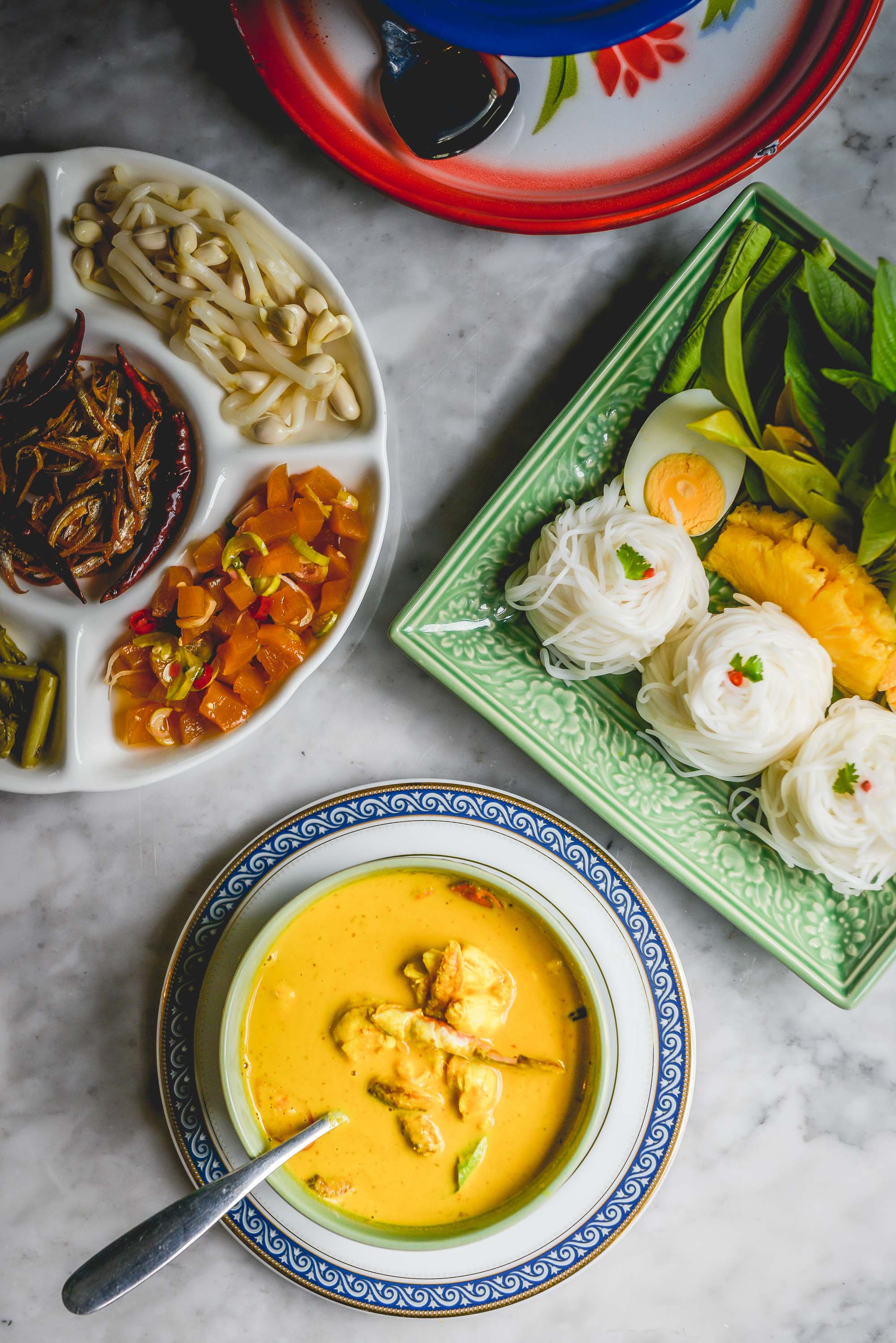 เมื่อมาถึงร้านแล้ว ลองเริ่มกันที่เมนูแรกอย่าง ขนมจีนน้ำยาปูภูเก็ต (350 บาท) ขนมจีน และเครื่องเคียง ที่เสิร์ฟมาคู่กับน้ำยาปูรสชาติเข้มข้น