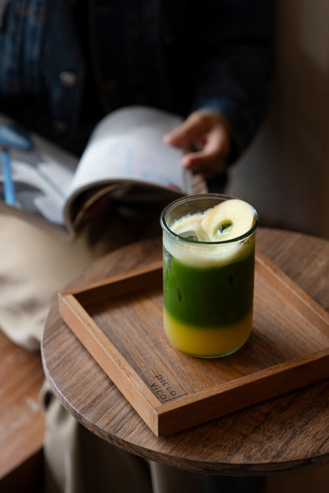 ต่อด้วยเมนูใหม่ล่าสุดในคอลเลกชันแอปเปิ้ลสกัดเย็นอย่าง Cold-Pressed Matcha-Apple (190 บาท) ที่คั้นน้ำแอปเปิ้ลสดแบบแก้วต่อแก้ว แล้วท็อปด้วยมัทฉะเข้มจากญี่ปุ่น ได้รสหวานหอมของแอปเปิ้ลที่เข้ากันพอดีกับความละมุนขมของมัทฉะ